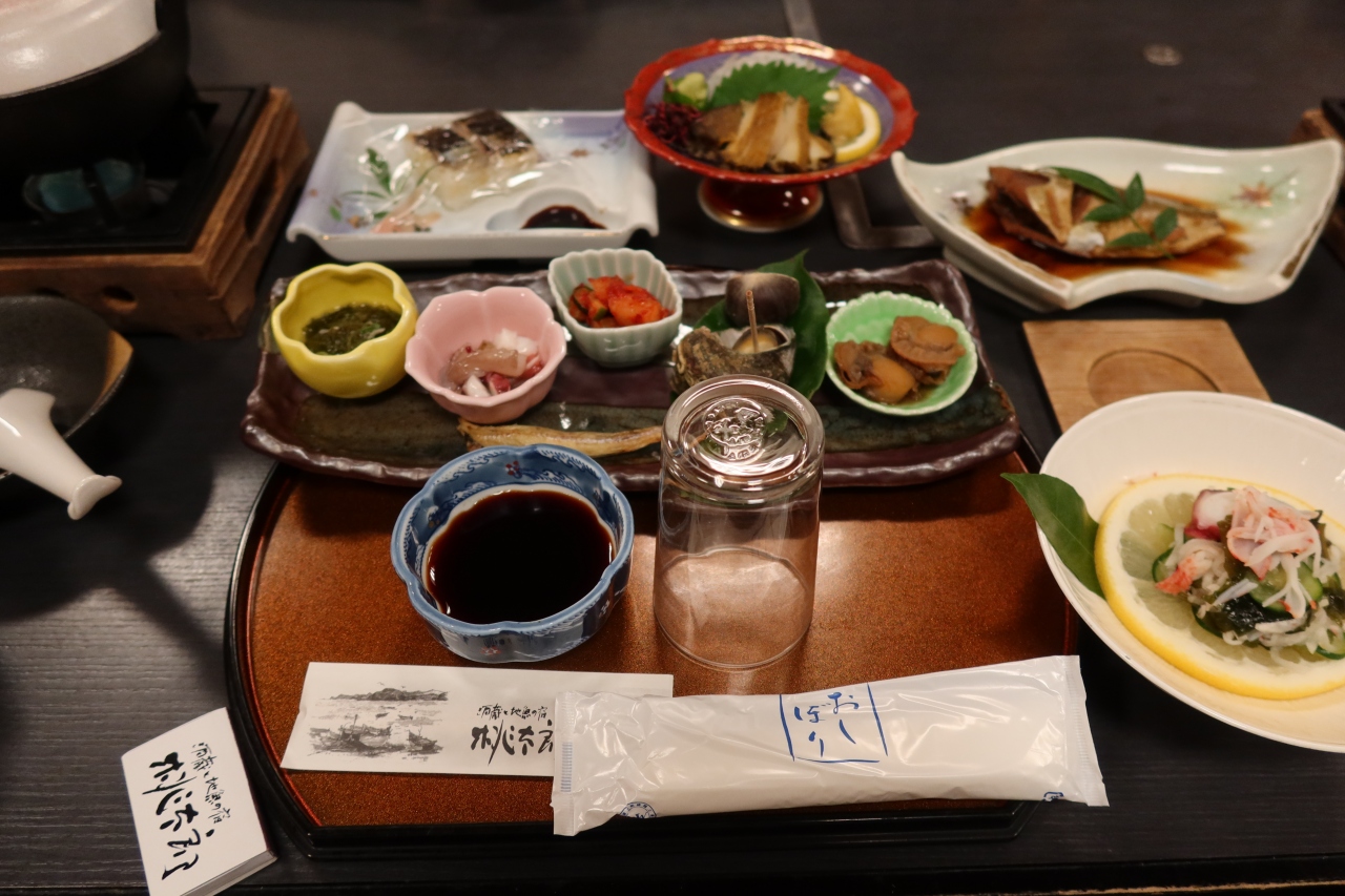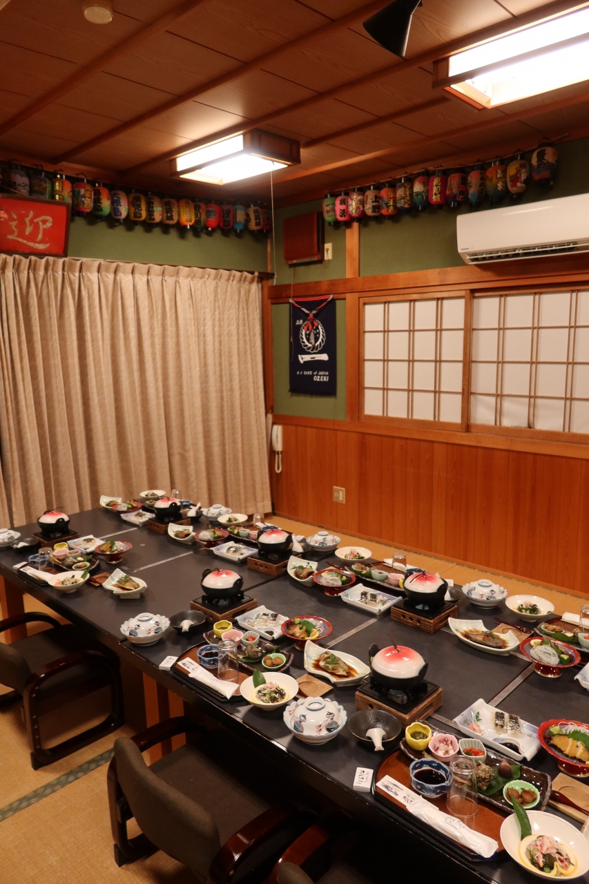 夕飯は大広間でいただきました。民宿の名と通り地の魚介がふんだんに使われており、かなり量もあり、味共に大満足。