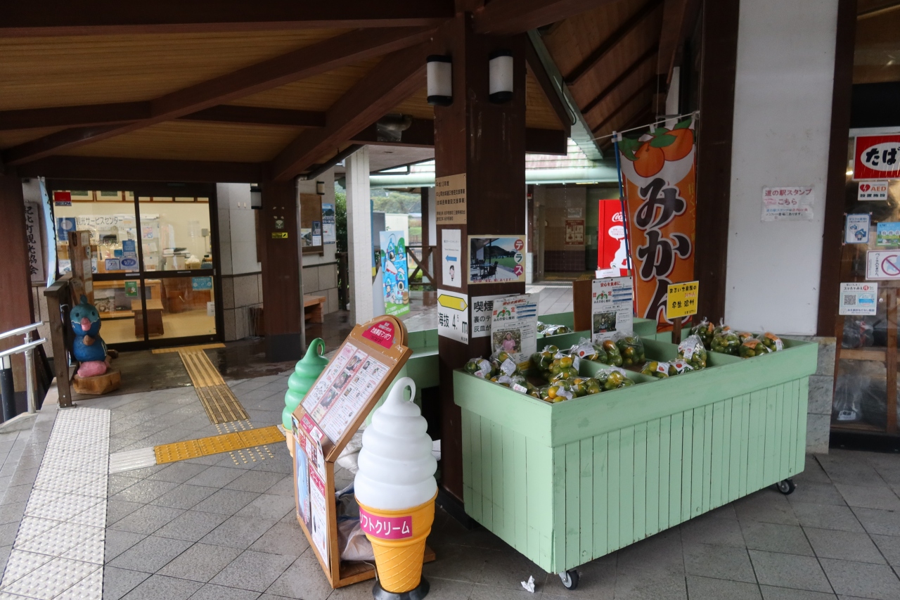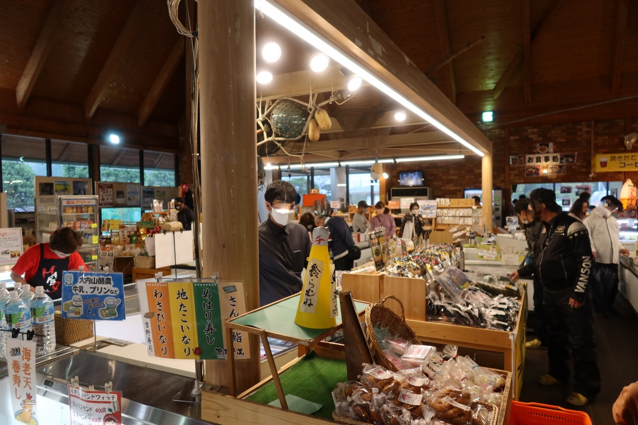紀伊長島の片上池の湖畔を通る国道42号線沿いにある道の駅が紀伊長島マンボウです。観光案内所、レストランが併設された店内では紀伊長島特産の干物等の海産物を中心とした物品が販売されています。特に干物は安く、カマスの干物は半額位で購入できるので2袋8匹も購入してしまいました。