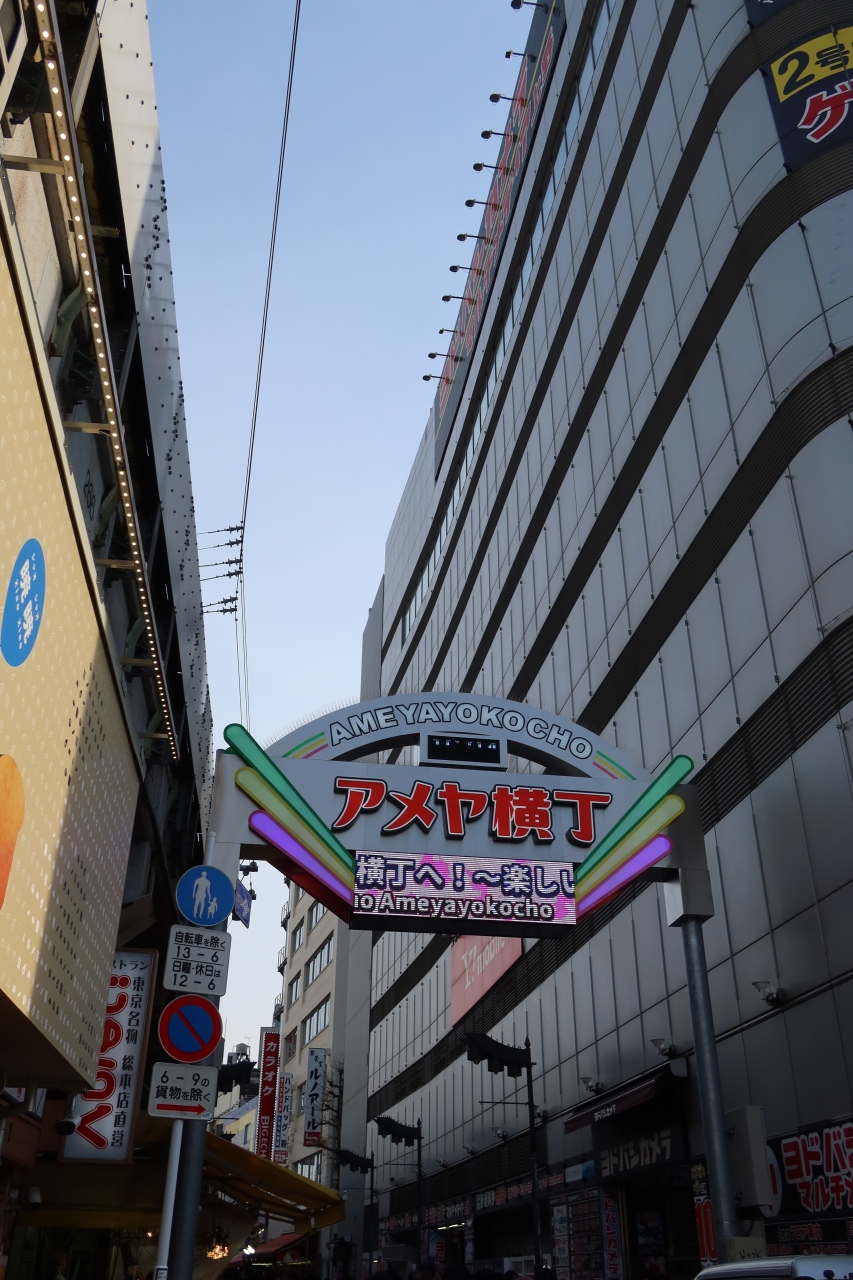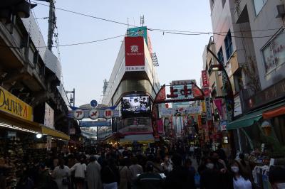 御徒町駅から上野駅のあ間の高架に西側沿いの通り一帯がアメヤ横丁問屋街、通称 アメ横です。アメ横では海産物、果物、衣料品、スポーツ用品等の商品が赤札で売られており、年末になるとアメ横の姿がよくテレビに流れます。