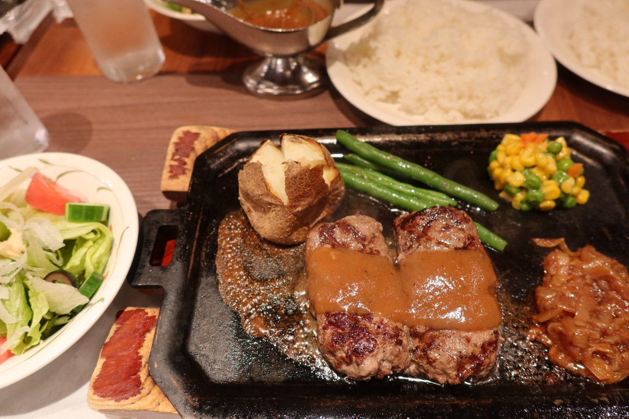 頂いたのは勿論オリジナルハンバーグ。鉄板に乗せられた俵型のハンバーグを客前で半分に割って焼くスタイルで、食べる前から食欲が湧きます。粗びきの挽肉は程よい硬さ、またソースが美味しいです。少し値段は高いと思いましたが、この味ならば納得。週末入れないのも仕方ないかと思いました。- 旅行時期