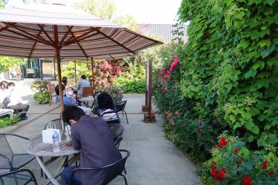 ガーデン前のオープンスペースに設置されたテーブルでバラの花を見ながら、ゆっくりと食べられるのは良い所ですが、売店は長蛇の列です。- 旅行時期