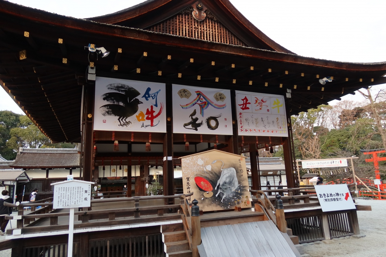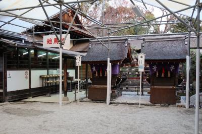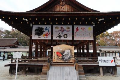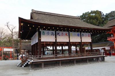 下鴨神社の楼門を潜った先正面にある建物が舞殿です。正月に行くといつもここに大絵馬が飾れら、毎年見応えがあります。今年は初詣ではなく、年明けまえに訪れたのですが、大絵馬は既に置かれておりました。また、人もすくなく、じっくりと観ることができましたが、やっぱり正月初詣の時がいいですね。