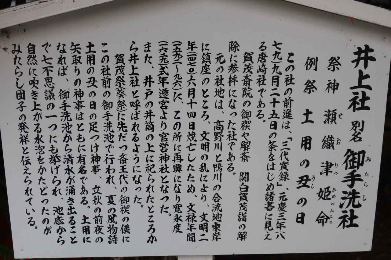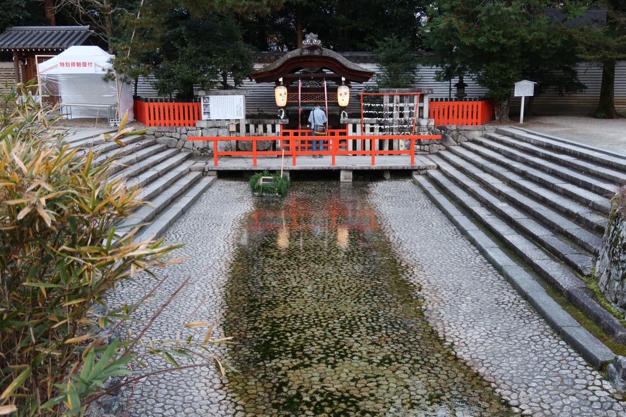 下鴨神社の楼門を潜り本殿の右手奥に行った所に御手洗社があります。御祭神は瀬織津姫で、この社殿の下から湧き出す湧水が御手洗池となり、御手洗川となり、糺の森を流れて行きます。みたらし団子発祥の地とも言われる由緒ある御手洗社は中々他では見られない神社で、私は好きになりました。