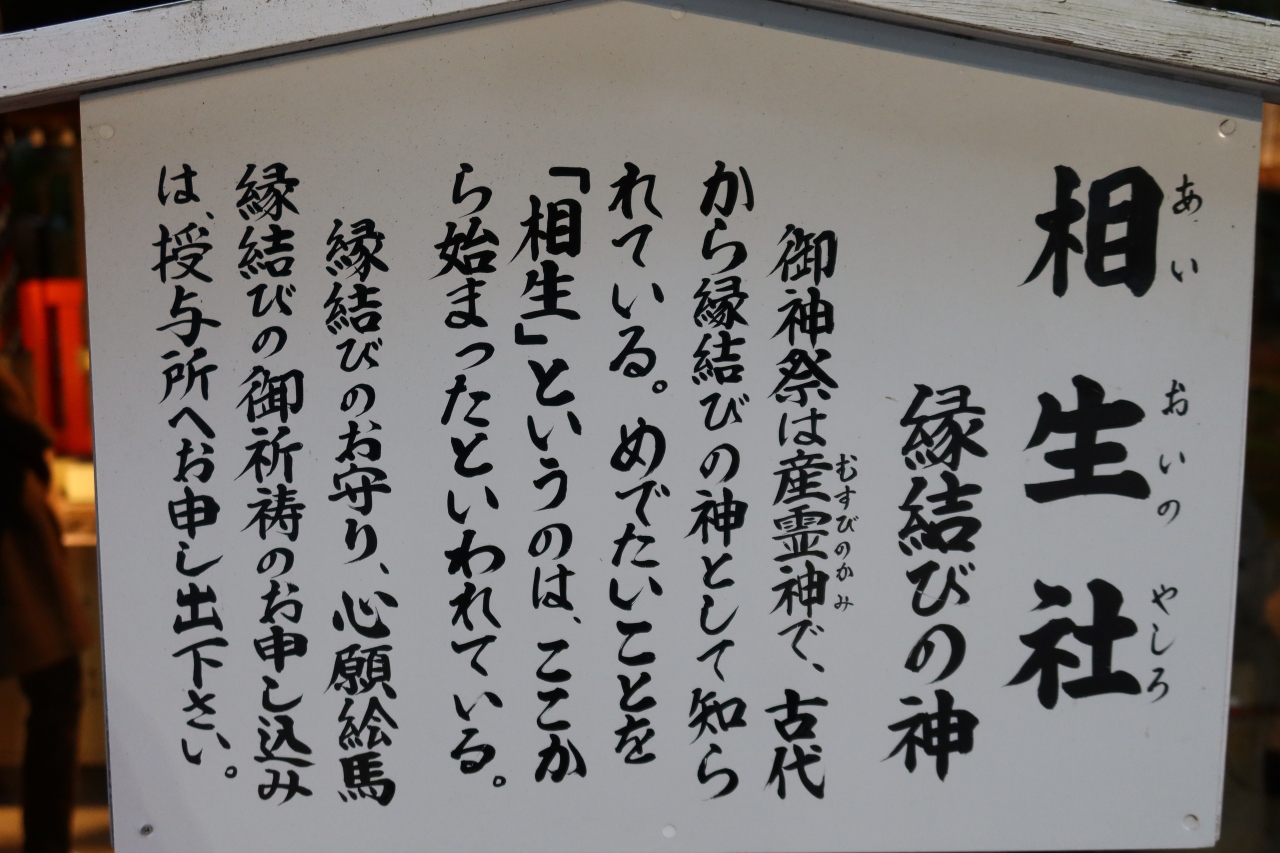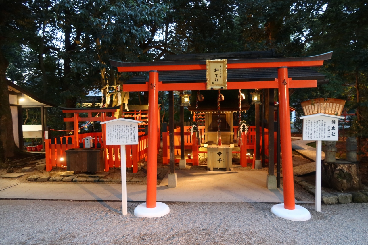 下鴨神社の楼門の手前左手にある神社が相生社です。社の左手には連理の賢木と呼ばれる御神木があり、2本の木が途中から結ばれ1本になっています。このため、縁結びの神社として有名で、女性の人の参拝がとても多く、はたから見ていると少し面白い。縁結びのお守りは親しい独身の人へのお土産には良いと思います。