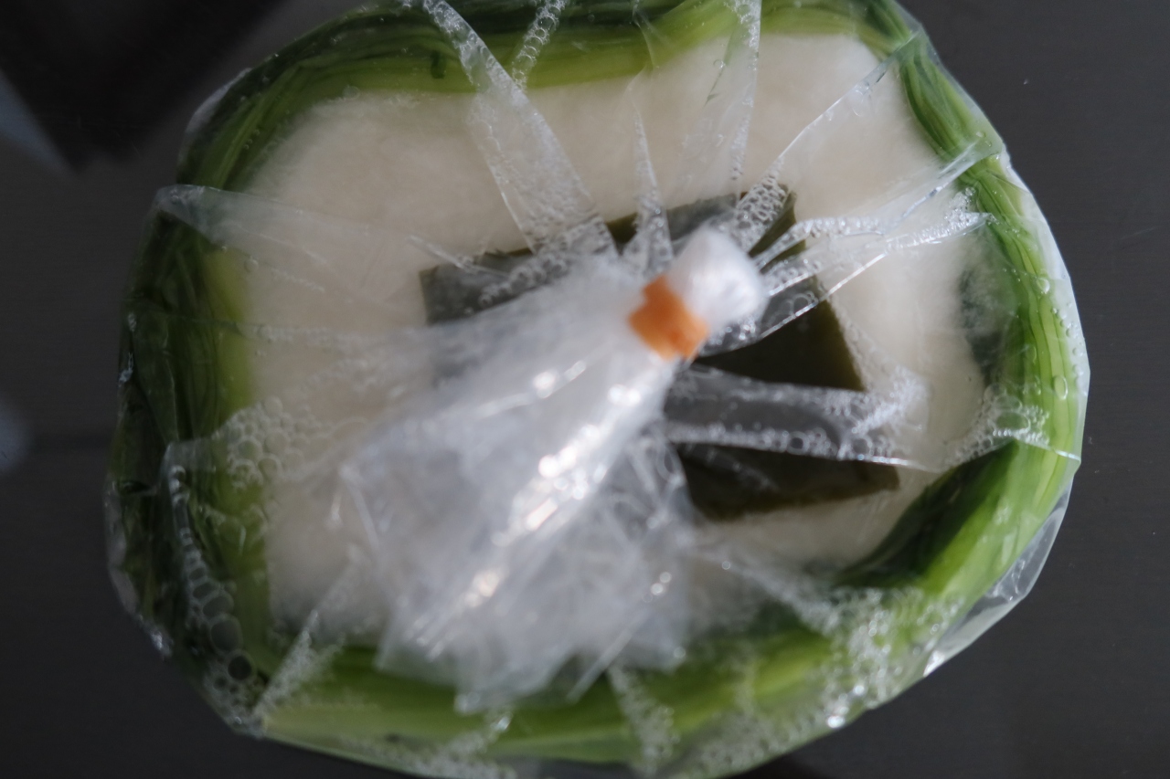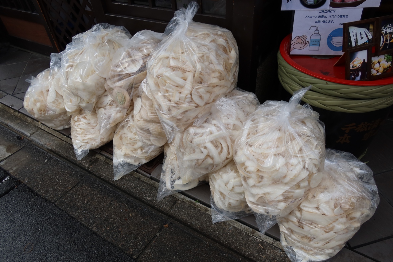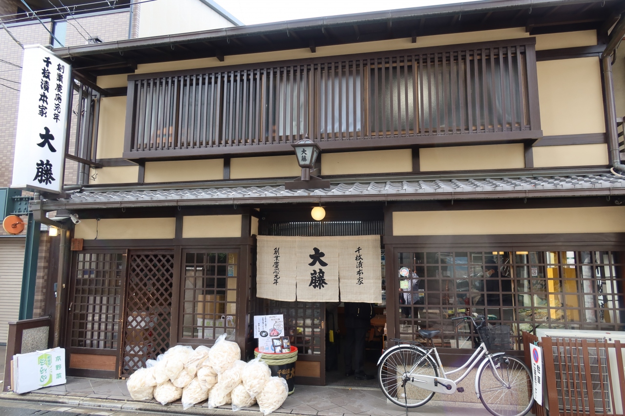 四条通りから麩屋町通りを北に50mほど入った所に大藤があります。千枚漬けの発祥と店と言われ慶応元年創業の老舗です。この店舗の奥で漬け込んでいるのか、店前には千枚漬けを剥いた聖護院かぶらの皮が入れられたビニール袋が置かれていました。