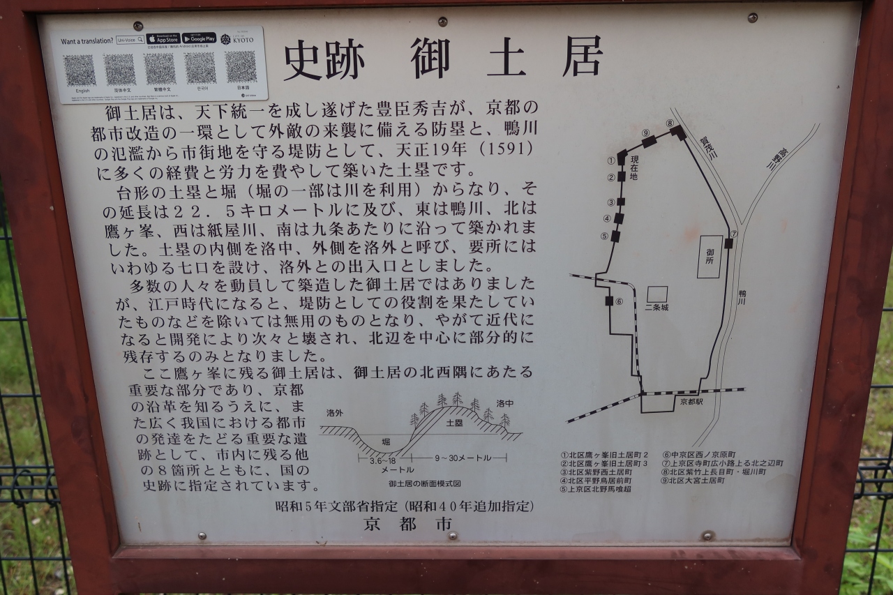 御土居は豊臣秀吉によって防塁兼堤防として京を囲む様に作られた土塁で、京都各地でその遺構が残っています。今回御土居の遺構を見学したのはブラタモリでも放送された鷹峯に残る御土居。柵の中に入って見ることはできませんが、土塁の姿ととても良く分かります。ま、歴史に興味のない人はただの土手にしか見えません。