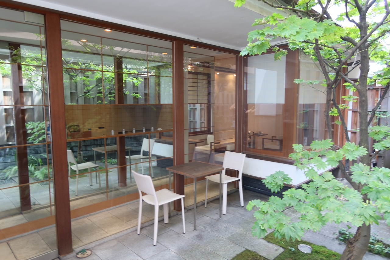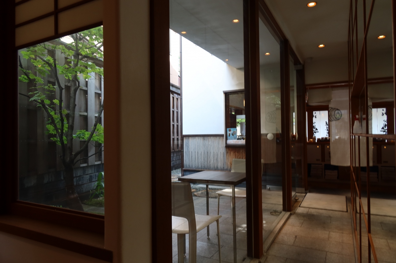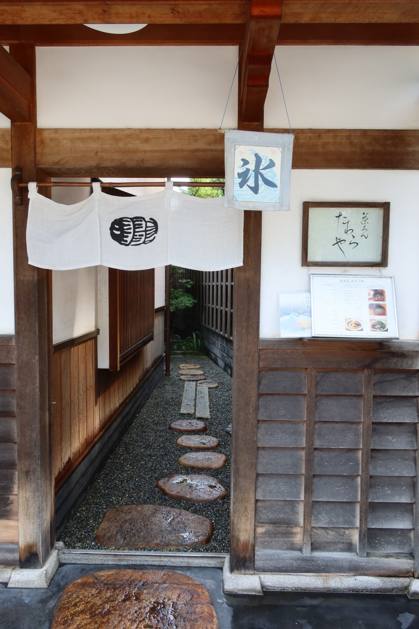 堀川寺之内交差点から50m程東に行った百々橋ひろばの正面に茶ろん たわらやがあります。俵屋吉冨小川店に併設された店内は4テーブル程しかないとても狭く、普段ならば並ぶのでしょうが、新型コロナの影響か私たちを含め客は二組だけでした。頂いたのはわらび餅と宇治金時かき氷。和菓子店の繊細な甘さがとても美味。