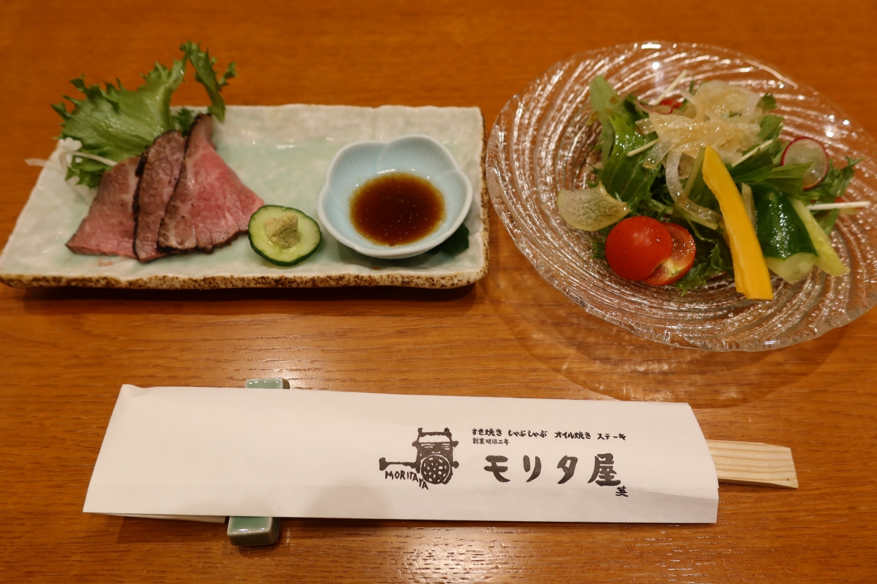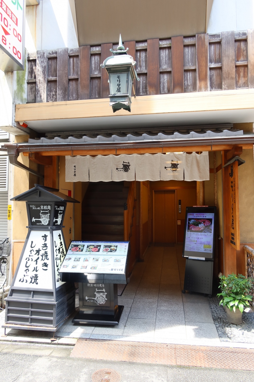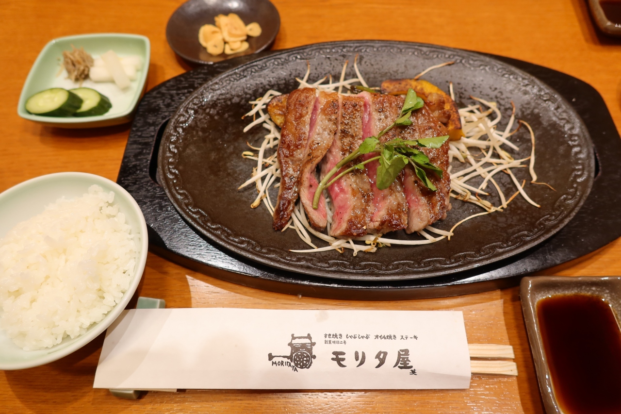 阪急 大宮駅から50m程東に行った所にモリタ屋 四条猪熊本店があります。開店してすぐに入ると予約もしていないのに個室に通して頂けました(コロナ対策のためでしょうか)。頂いたのは和牛サーロインステーキのコース。本来3200円で120gの肉なのですが、増量サービスで同じ値段で150gの肉が頂けました。スープ、前菜、サラダ、お新香、ご飯(お替り可)がついてこの値段、この味とは驚き。東京ではこんな店はありません。味もサービスも良く大満足のお店でした。