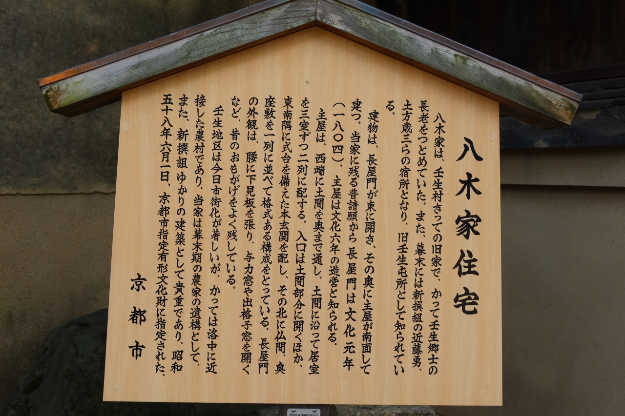 幕末期に新選組の屯所として使用された八木邸が壬生郷士八木邸として公開されています。実際に屯所として使用された建物がそのままん残っており、芹沢鴨が殺害された部屋には鴨居に刀傷が残っており、生々しさを感じます。ガイドの方が説明をしてくれるのですが、歴史ファンにとっては知っていることが多く少し物足りなさを感じました。