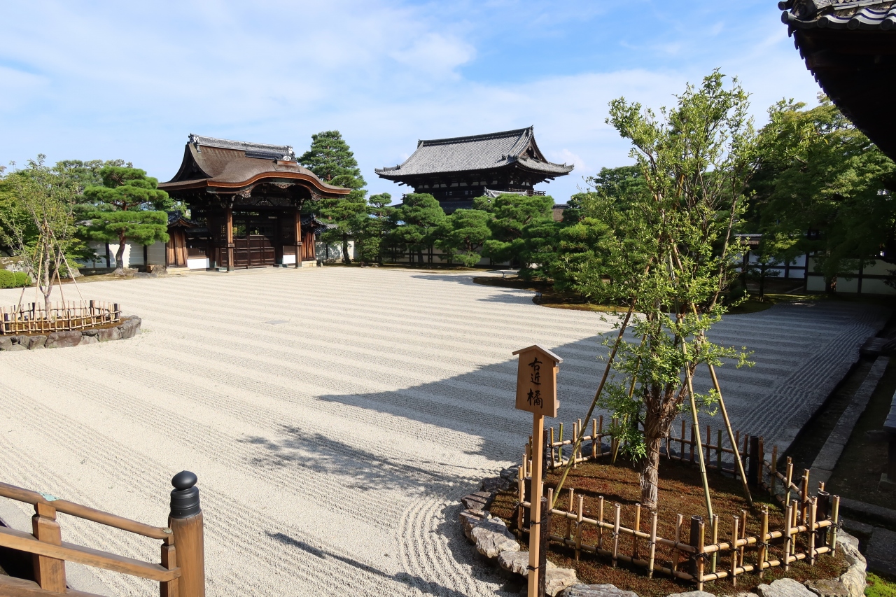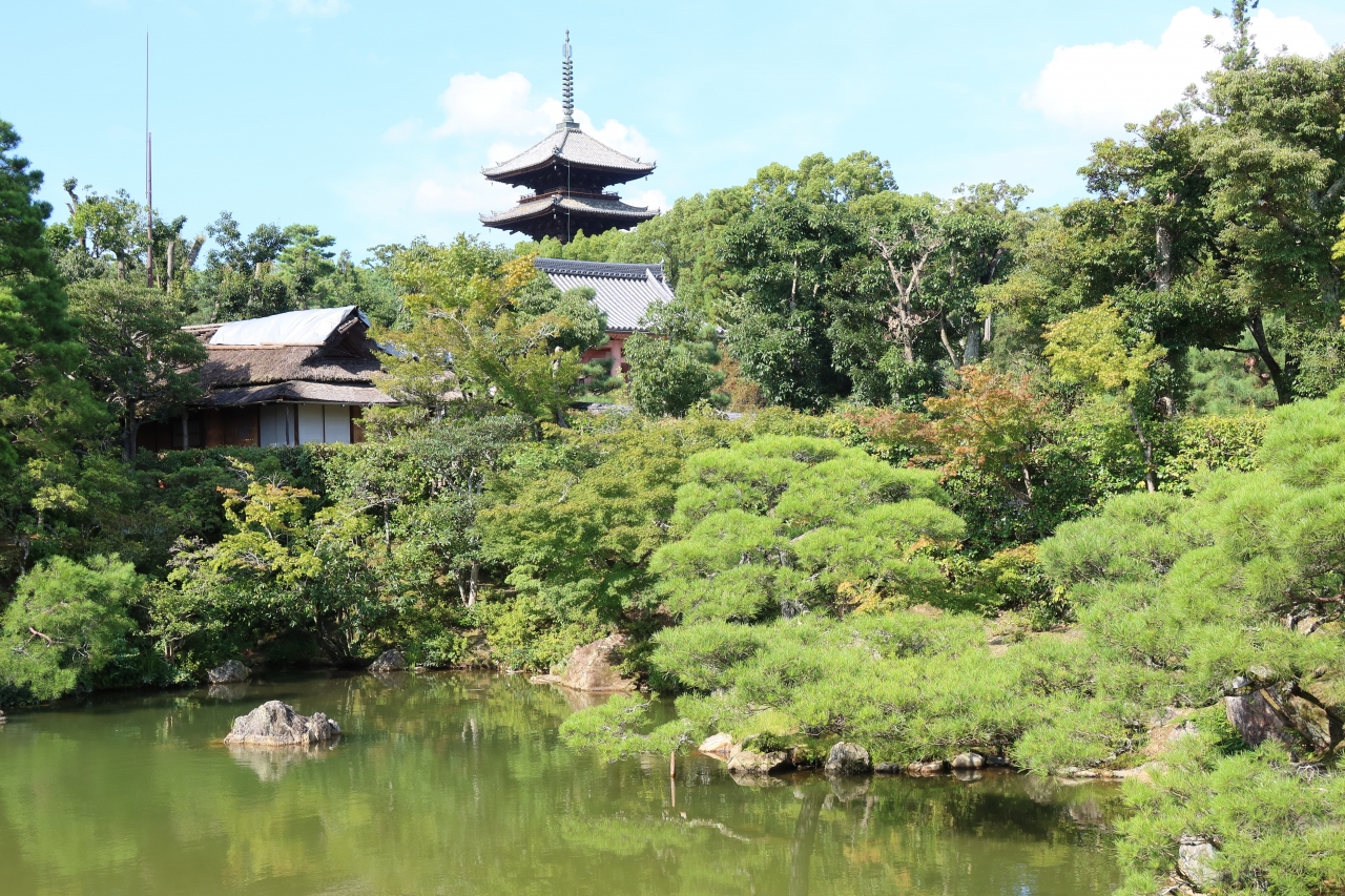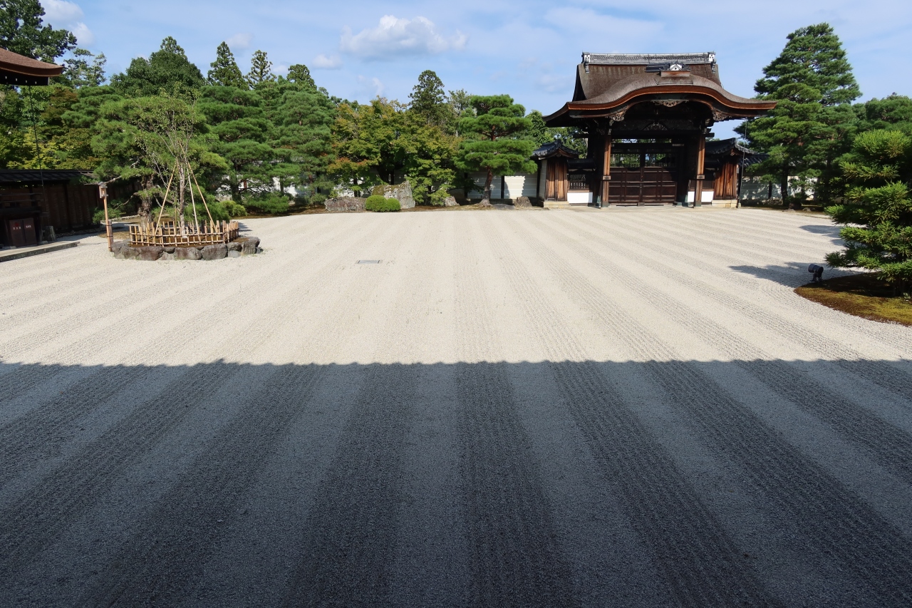 世界遺産に指定される仁和寺の二王門を潜り左手に行った所に御殿(旧御室御所)があります。この御所には宸殿を挟んで南側に勅使門の前に広がる白砂が美しい南庭、北側に五重塔をバックにした池泉式庭園の二つがあります。同じ場所で全く趣きが異なる庭園が見られる所が面白く見応えがあります。