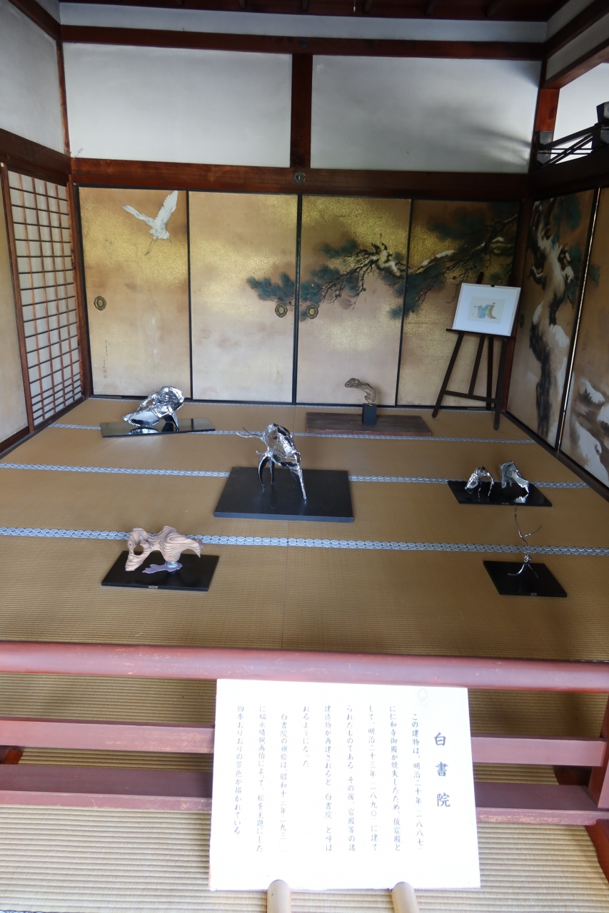 世界遺産に指定される仁和寺の御殿の南庭に面した西側の建物が白書院です。明治20年に御殿が焼失祭に仮宸殿として建てられた建物です。南庭面した三室には美しい松の木の姿が描かれた襖絵が見事です。それぞれ趣きが違い見ごたえがあります。