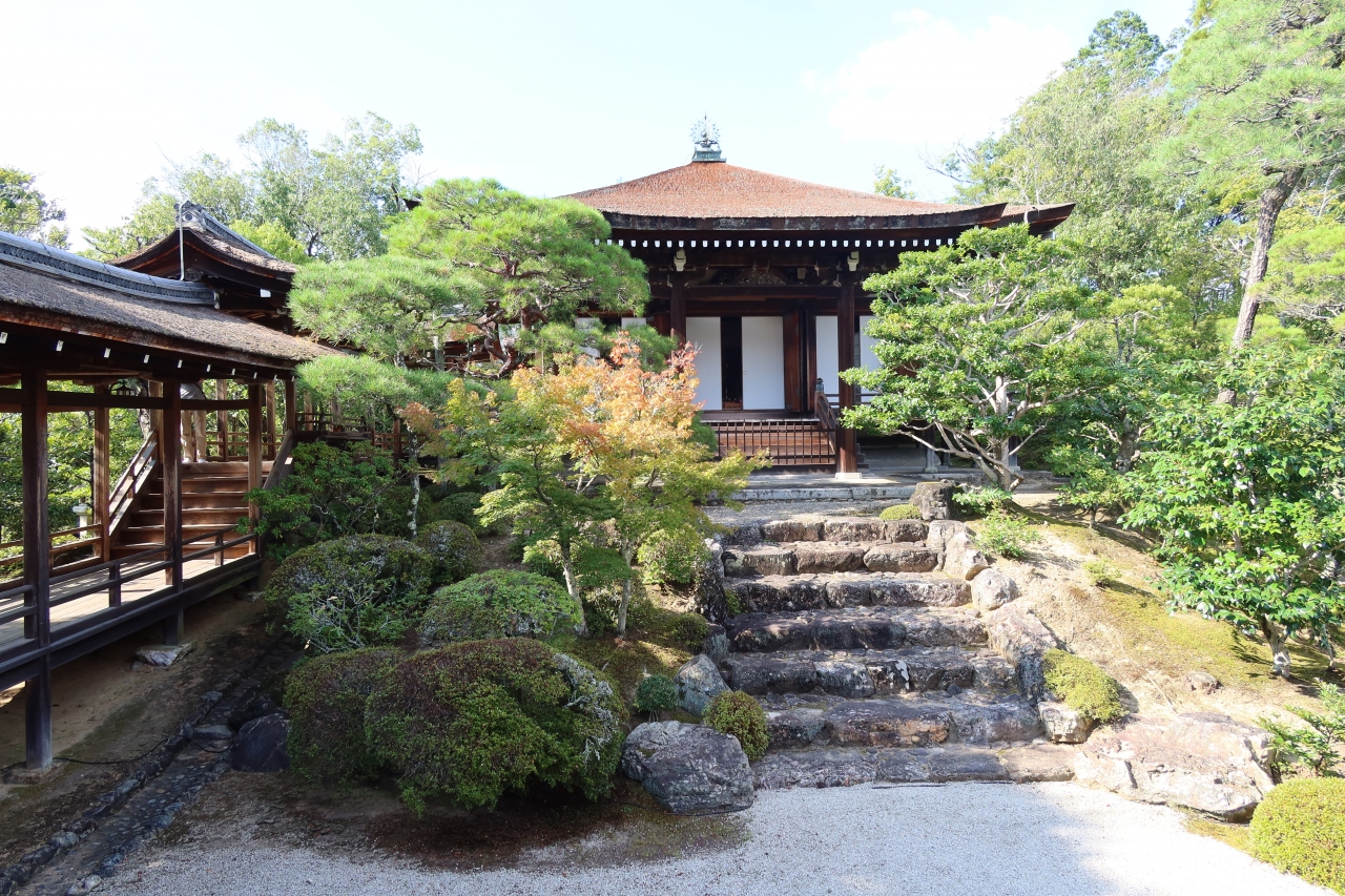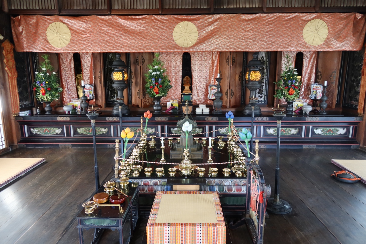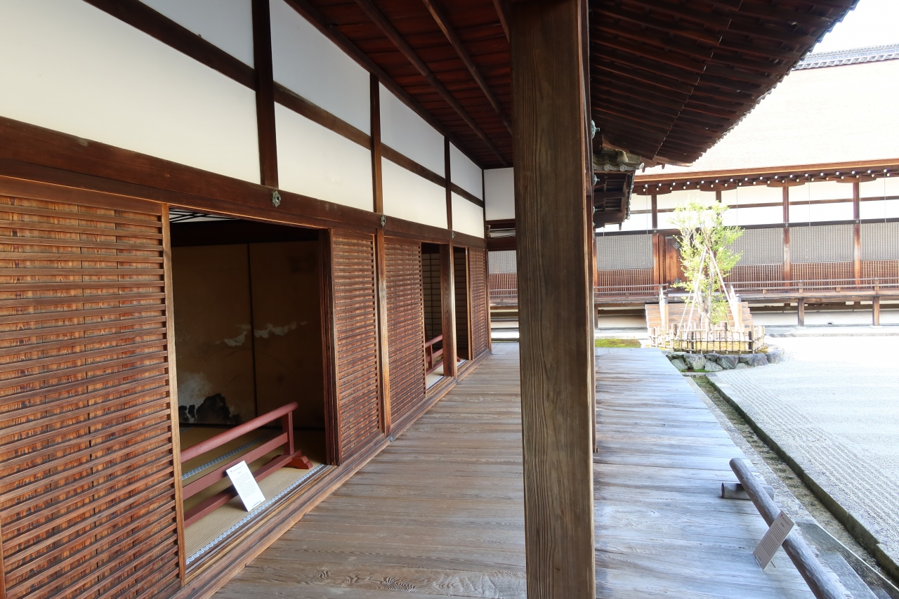 世界遺産に指定される仁和寺の御殿の最奥、黒書院から渡り廊下を進んだ先に霊明殿があります。御殿にある唯一の仏殿で板間の祭壇には歴代門跡のご位牌が祀られています。檜皮葺、木造平屋造りの霊明殿も意外と古くは無く、明治時代に作られた物。世界遺産に指定されている割には新しい建物が多いのに驚きました。