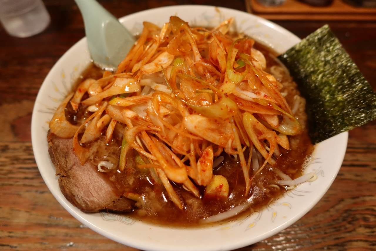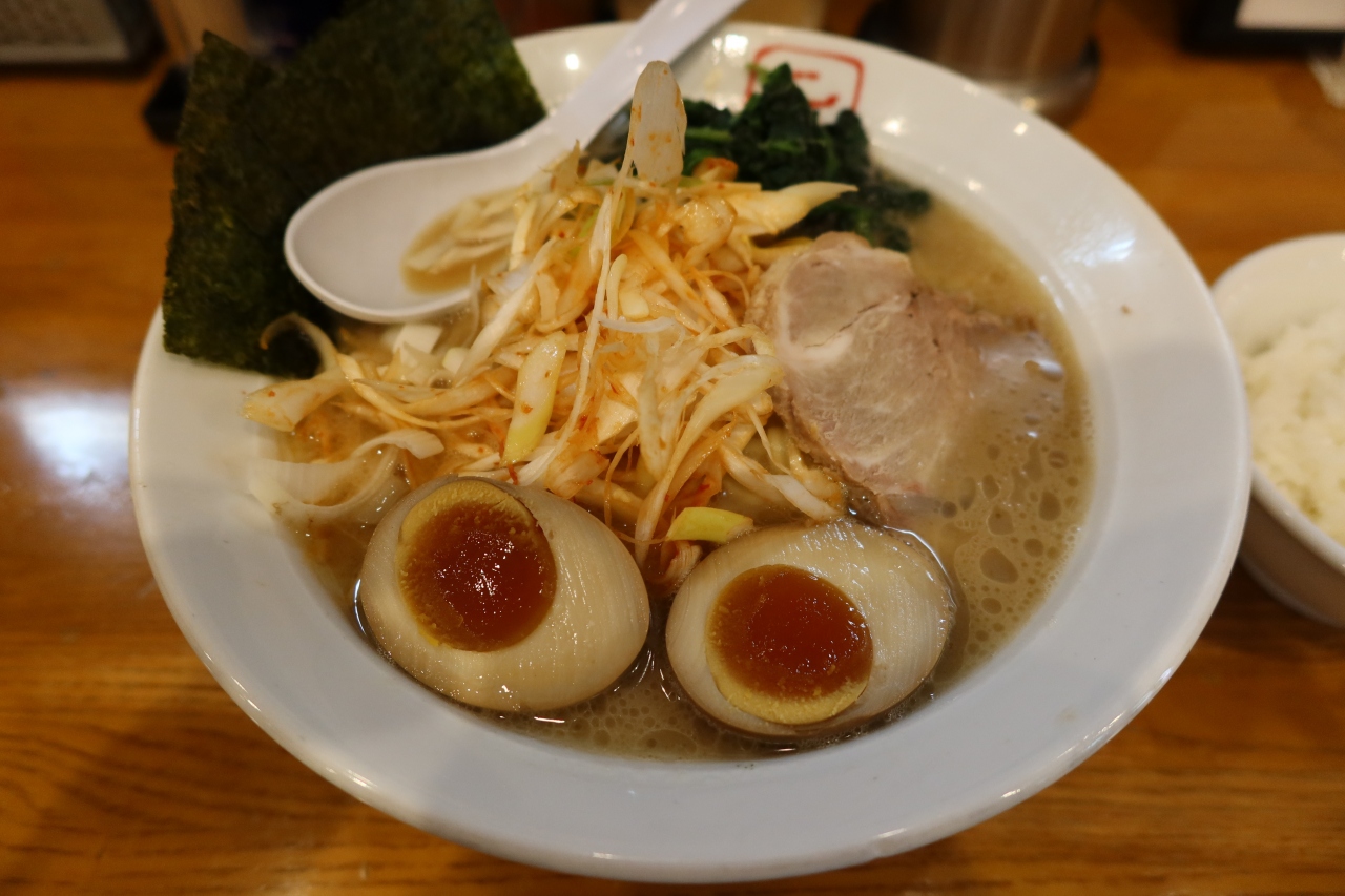 江田駅から246を渡って港北ニュータウン側に3,400m程行った富士塚交差点近くにあるラーメン店です。店内は左手厨房前にカウンター席、右手にテーブル席が5テーブル程あります。ラーメンはとんこつラーメンがメインで、頂いたのは黒とんこつネギラーメン。スープはとんこつですが、しつこくなくニンニクの香ばし匂いが食欲をそそります。辛味のつけられたネギもシャキシャキとして美味しいです。難点を言えばネギラーメンはモヤシはいらないかと思いました。