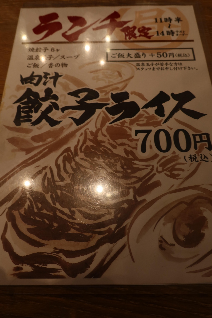 青葉台駅からバスロータリーを越え交差点を渡った先に肉汁餃子製作所ダンダダン酒場 青葉台店はあります。以前から気になっていたお店で、今回ランチで初めて利用しました。メニューを見ると麻婆豆腐や麺類もあるようだったのでランチメニューもあると思い入店した所、単品物以外のランチメニューは餃子ライス700円だけ。これを頼むしかありませんでした。頂いた餃子ライスは餃子6個に、スープ、温泉卵、ライスの4品。餃子はお店の名前の通り肉汁たっぷりで思った以上に美味。この値段、この味で700円ならば納得です。