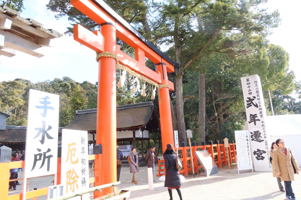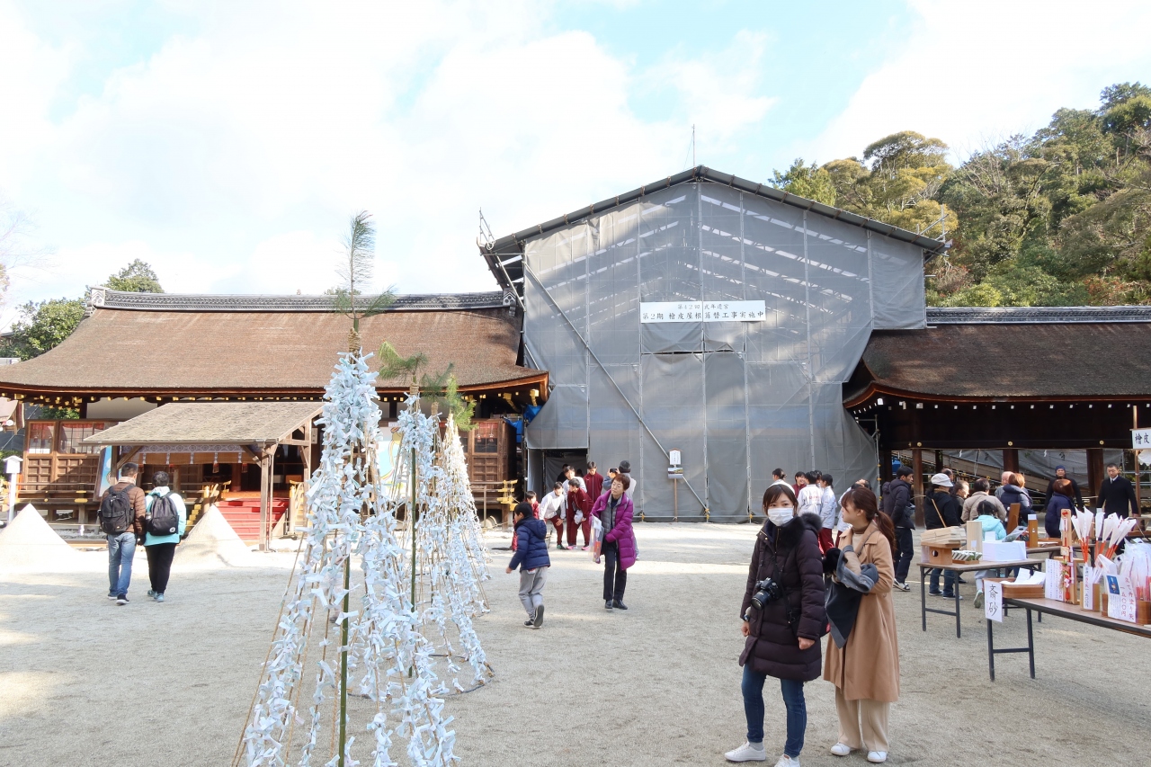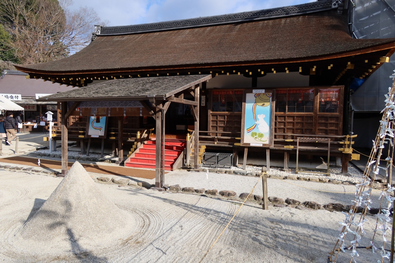 京都市内から賀茂川の上流に行った御園橋近くにある世界遺産にも登録される大きな神社が上賀茂神社です。何時もは下鴨神社に初詣に行くのですが、今年は上賀茂神社にしました。広い境内の奥に神域があり、本殿は国宝に指定される他、多くの需要文化財があります。初詣客は下鴨神社程多くなく、ゆっくりお参りができます。雰囲気もとっても良いのでアクセスは悪いですが、下鴨神社よりもお参りし易い神社です。