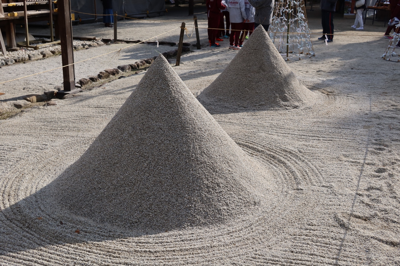 上賀茂神社の細殿の前に砂を円錐形に盛った2つの砂山があります。これが立て砂です。本殿の後ろにある神様が降り立った円錐形の形をした神山をかたどって、砂が盛られているそうです。京都の神社では古くからの云われのある縁起物があり、上賀茂神社の見物でもあり、パワースポットでもあります。