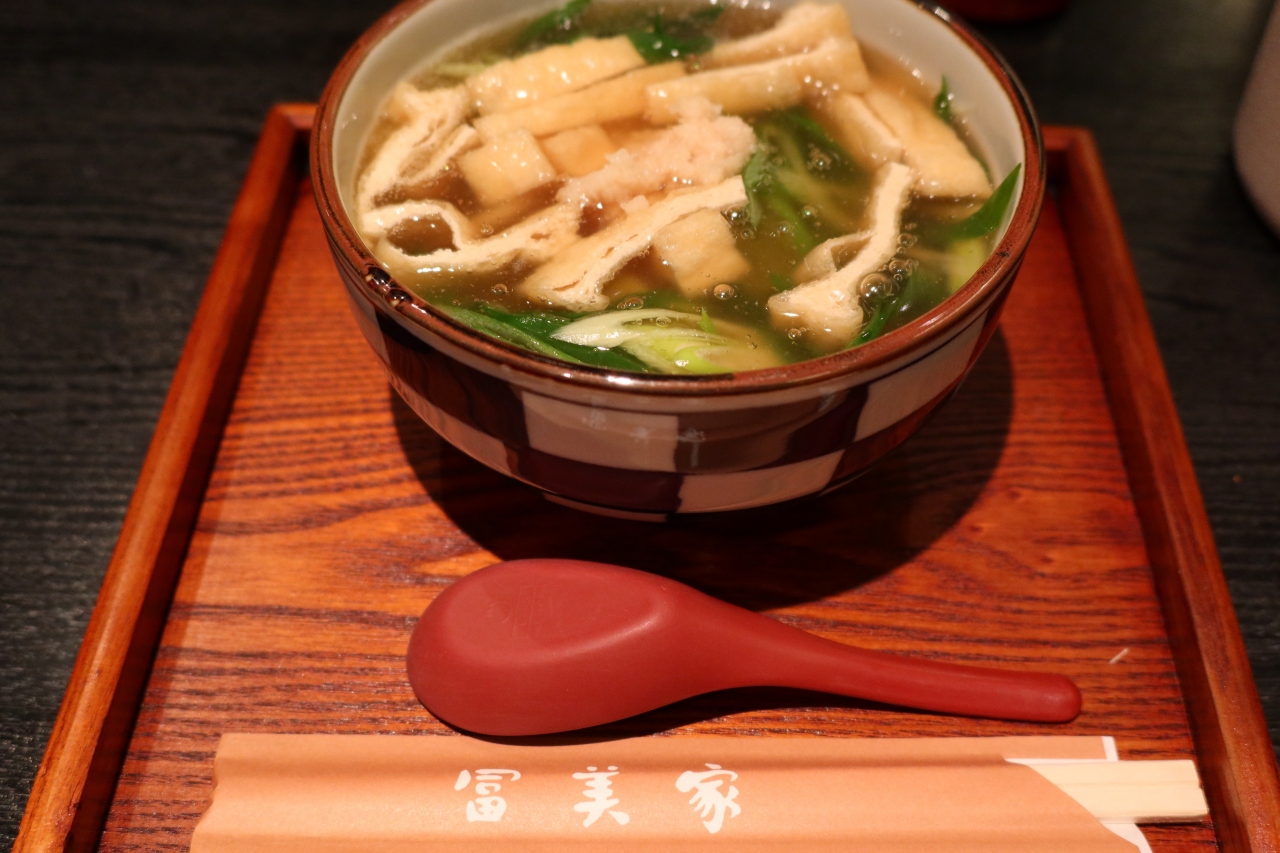 頂いたのは餡かけうどん、きつねうどん、冨美家鍋。いずれもしっかりと出汁の効いた京うどんは美味。そしてその値段は7,800円と有名店としては滅茶苦茶安い。