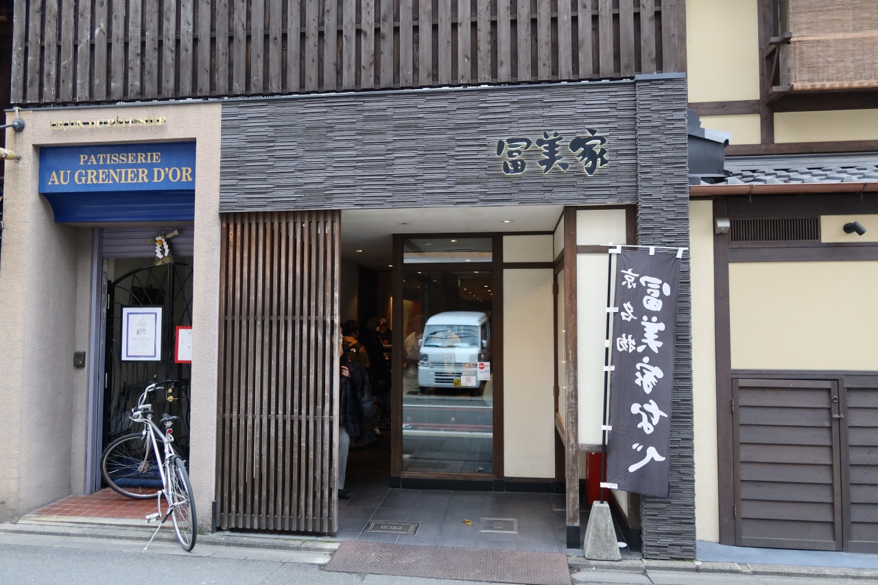 京都の台所 錦市場から堺町通りを50m程上がったところに、うどんが有名な冨美家はあります。正月3日の2時過ぎに行くと店内は満席、入り口は長蛇の列でした。30分待って入店。店内はうなぎの寝床の様になっており、カウンター席とテーブル席があります。
