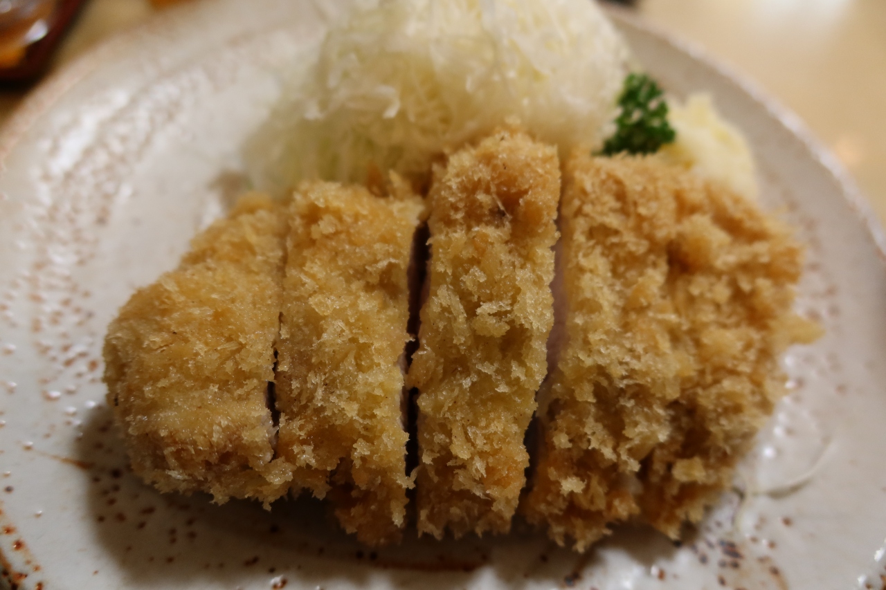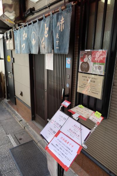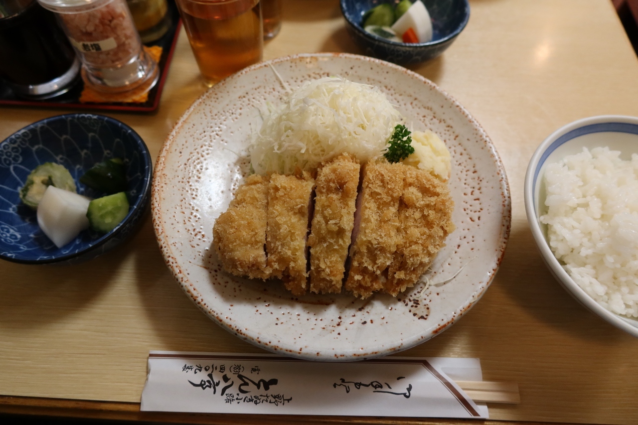店内はカウンター席とテーブル席で15人も入れば満席になってしまう程の小さなお店。ご夫婦二人で営んでいるようです。頂いたのはお薦めのロースかつ定食。味噌汁、漬物、ご飯がついて1900円。キャベツとご飯は1回はお替りができます。サクッしたロースかつはサクッととしており、肉は分厚いですが、とても柔らかく美味しく、2種のソースや塩で味付けを変えてだべると面白いです。- 旅行時期
