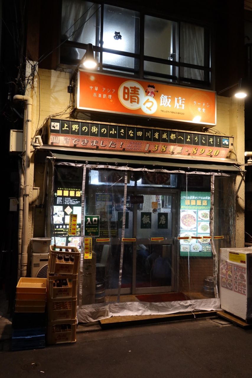 上野駅の東側、岩倉高校近く、昭和通りから少し入った所に晴々飯店があります。店頭には透明なビニールのカーテンが張られ、中もちょっと小汚い感じがするお店で一瞬戸惑いました。料理は四川料理のお店で、辛い料理がお薦めの様です。頂いたのは大辛の麻婆豆腐、青椒肉絲、成都風チャーハン、棒棒鶏、水餃子。どの料理も辛味が効いており、とは言っても滅茶苦茶辛い訳でもなく、美味しいです。コスパも良く、四川料理を気軽に楽しめるお店です。