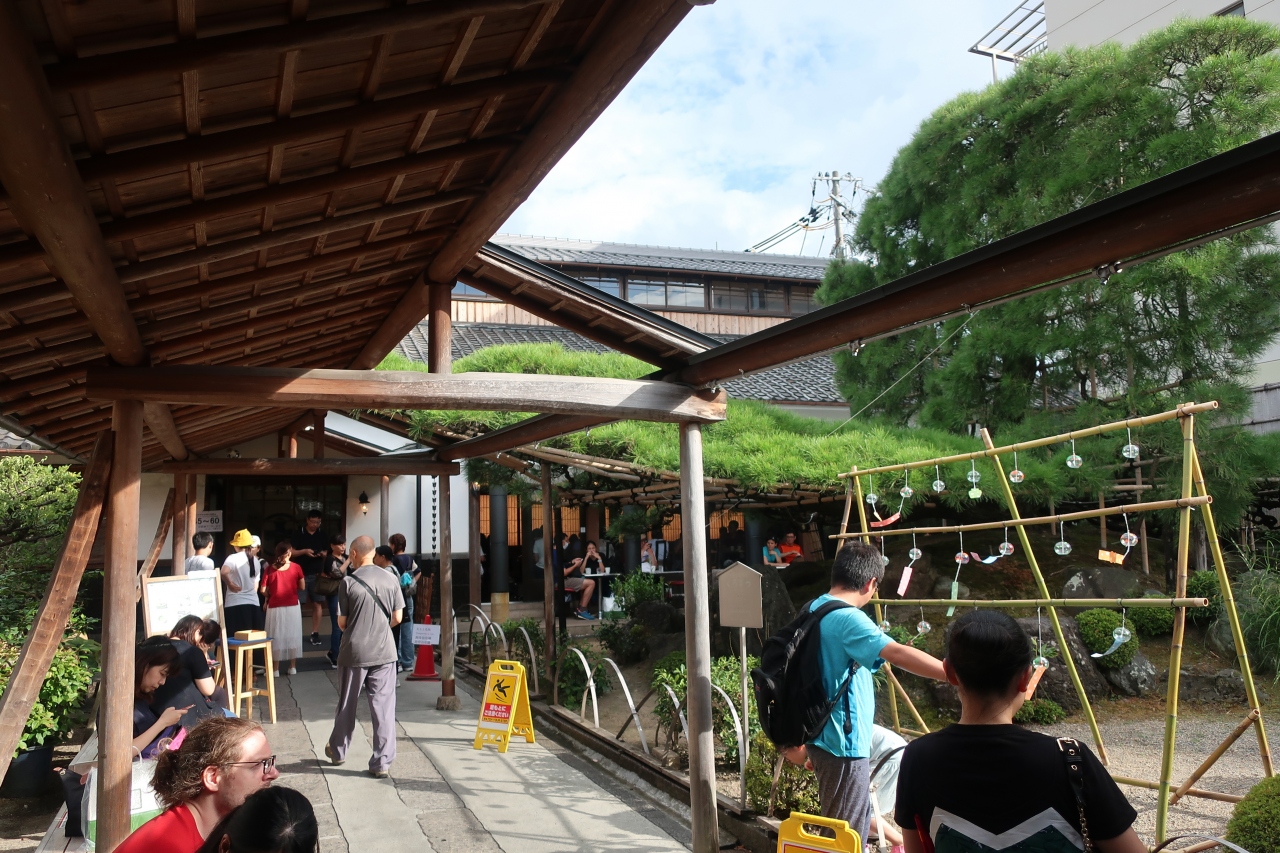 JR宇治駅から宇治橋通り突き当たった所にある古い重厚な建物が中村藤吉本店 宇治本店です。建物自体も重要文化財に指定される老舗のお茶屋さんで、入口入って直ぐに売店、奥に日本庭園と甘味処があります。売店ではお茶は勿論、水出し煎茶や茶菓子が売られており、こちらは並ばなくても入れるのですが、甘味処は裕に一時間半待ちで入るのを諦めました。それほど混んでます。