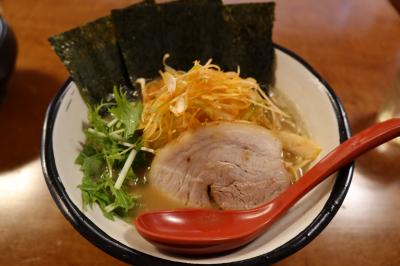 青葉台駅から環状4号線を柿生方面に1km程行った所にあるラーメン店です。平日の昼すぎに行くと先客は1人だけで、ほぼ貸し切り状態。店内はカウンター席とテーブル席があったのdすが、一人でテーブル席を使わせていただけました。頂いたのはネギラーメン。濃厚豚骨スープに太麺の上にネギ、海苔、チャーシューが乗ります。少ししつこい感じはありますが、味は普通でした。
