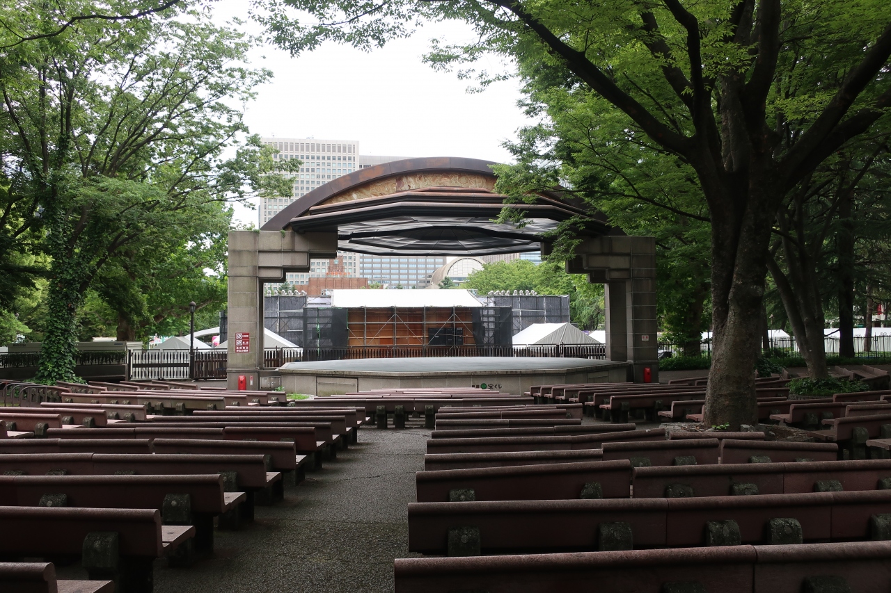 日比谷公園の中には2つの音楽堂があり、噴水広場の近くにある方が小音楽堂です。明治38年に日本国内初の野外音楽堂として作られた物です。訪れたときは何のイベントも開かれていませんでしたが、観客席に木々が茂る音楽堂はとっても良い雰囲気。まるでヨーロッパの庭園にある音楽堂の様です。私は大音楽堂よりも小音楽堂の雰囲気の方が好きです。