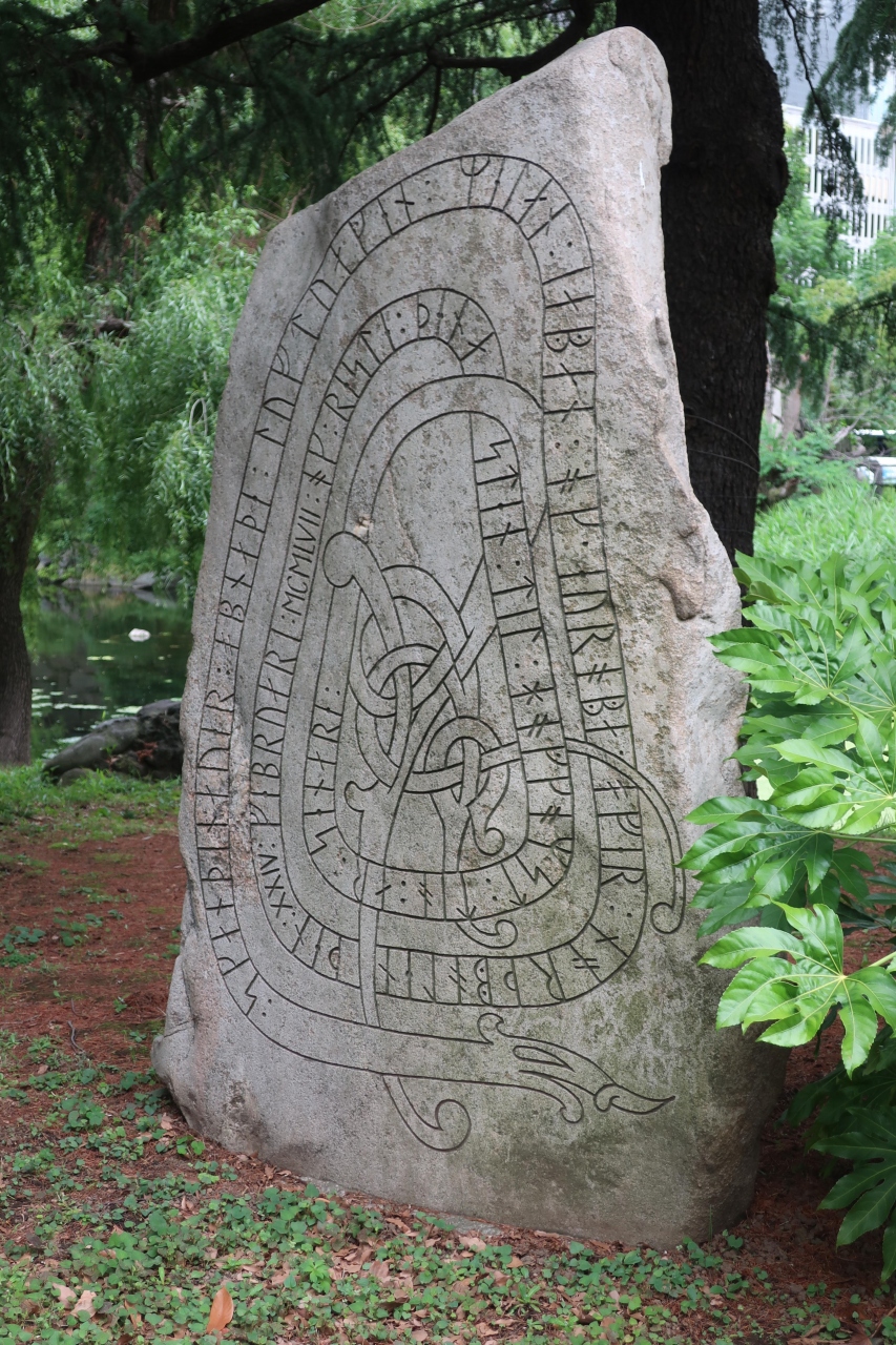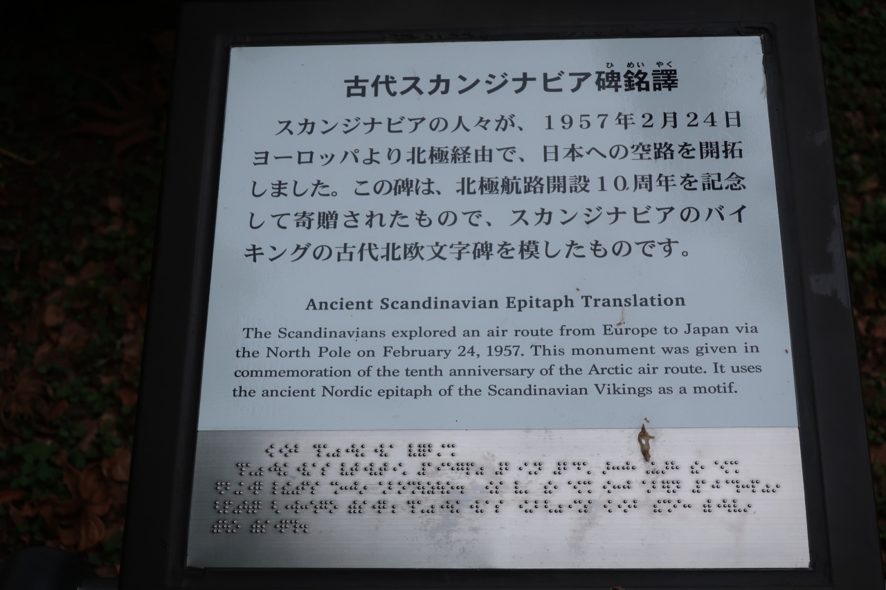 日比谷公園の北西部にある心字池の南側淵に古代スカンジナビア碑銘譯があります。1957年2月24日ヨーロッパより北極経由で、日本への空路を開拓、北極航路開設10周年を記念して寄贈された碑です。表面には幾何学模様の様な古代北欧文字が刻まれており、不思議な感じがします。