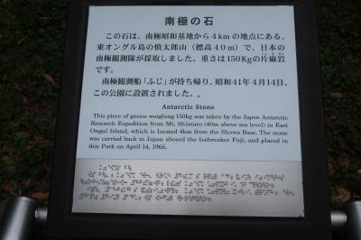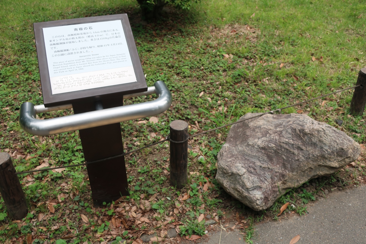日比谷公園の北西部にある心字池の南側の歩道の脇に何の変哲もない石がさりげなく置かれています。これが南極の石です。昭和基地から約4km、東オングル島の慎太郎山で採取されてものです。案内板がなければ、そこらへんの石と変わらず通り過ぎてしまうような石ですので、見応えはありません。