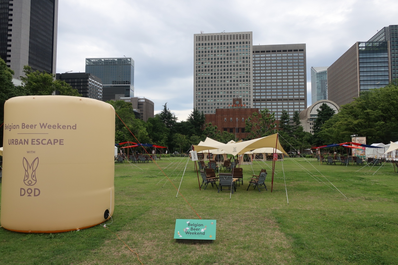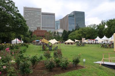 日比谷公園の大噴水広場の南側にある芝生の広場が第二花壇です。噴水から第二花壇をみるとその先に日比谷公会堂。さらにその奥に日比谷シティ等のビル群が見え、ちょっとニューヨークのセントラルパークに似た感じが味わえます。訪れたときはビアガーデンのテント広場になっており、こんな中ならビールさぞかし美味しいことでしょう。