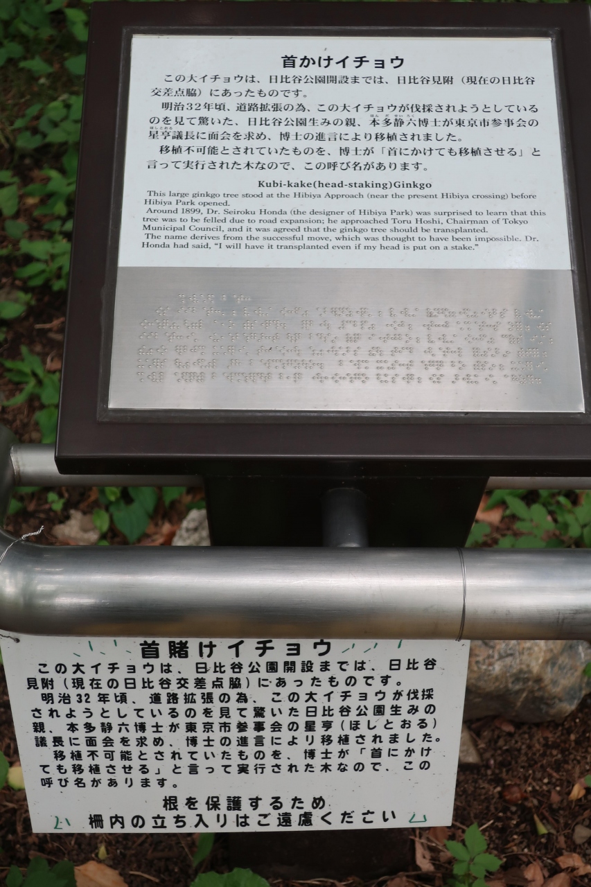 日比谷公園のほぼ真ん中にあるレストラン松本楼の南に一際大きな幹回りが6,7mもある大きなイチョウの木があります。このイチョウが首賭けイチョウです。日比谷通りの拡張に際しイチョウを伐採することになったのを、日比谷公園の設計者である本多静六が東大教授の職を賭けて現在の場所に移植したことから、この名がついています。