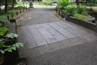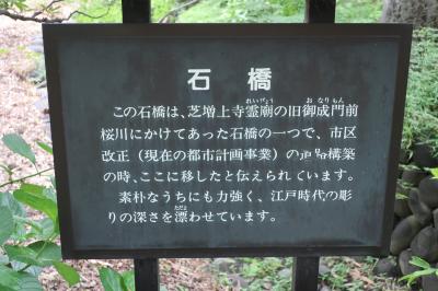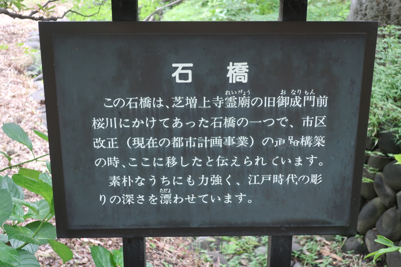 日比谷公園の首掛かイチョウの近くの通路に石橋があります。石の板が8枚程縦に架けられたフラットな石橋に普通に歩いていると橋であることに気付かないような身近な橋です。元は芝増上寺霊廟の旧御成門前桜川に架かっていたものを移設したものだそうです。他の展示物もそうですが、何故日比谷公園に移設されたのか不思議です。