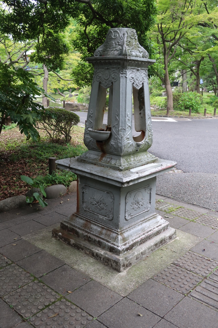 日比谷公園の松本楼と雲形池のほぼ中間地点と、三笠山の麓に馬の水飲み場跡があります。色は違いますがどちらも同じデザイン。日比谷公園開園時の明治36年製で当時は未だ馬が交通手段として使われており、水飲み場があった様です。なかなか洒落たデザインですが、日比谷公園の中を馬がかっ歩していたのかと思うと面白くなります。