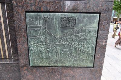 中央通りと銀座マロニエ通りのカルティエのある交差点角に電気灯柱記念碑があります。ビルの壁に埋め込まれたプレートには明治15年に初めてアーク灯が灯され、人々が見上げる姿が描かれています。見落としてしまいますが、中央通りにはこのアーク灯が再現されています。銀座が新しいものを取り入れて来た最先端の場所だった(今でも)ことが分かる記念碑です。