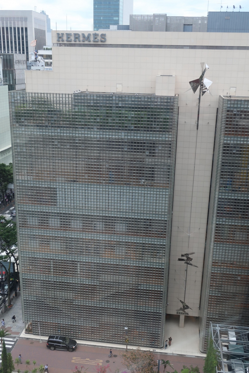 数寄屋橋交差点の近く、銀座ソニーパークの後ろにエルメス銀座店があります。この店は日本の中でも一番の旗艦店。品揃えも多いのですが、庶民には畏れ多くて、中々中には入れません。エルメスのビルは以前までソニープラザに隠れその全貌はなかなか気づきませんでしたが、ソニープラザがなくなるとガラスブロックで埋め尽くされた外観が見事です。イタリアの建築家の設計だそうです。まるで、銀座ソニーパークが前庭の様です。建築的にもすばらしい店(ビル)です。