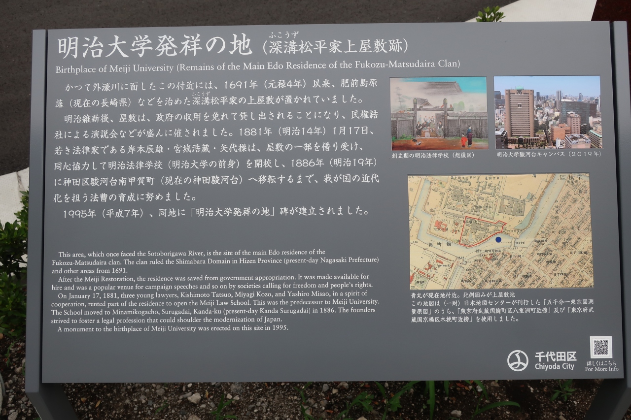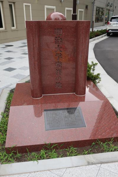 数寄屋橋交差点から首都高を潜り日比谷方面に行った所に明治大学発祥の地の記念碑があります。明治大学と言えば「白雲なびく、駿河台~」と校歌に唄われるので駿河台が発祥の地だと思っていたのですが、こんな銀座に近い有楽町に大学が作られたとは思いもしませんでした。しかし、記念碑と説明版だけなので見応えはなく、「そうなんだぁ」と思うだけでした。