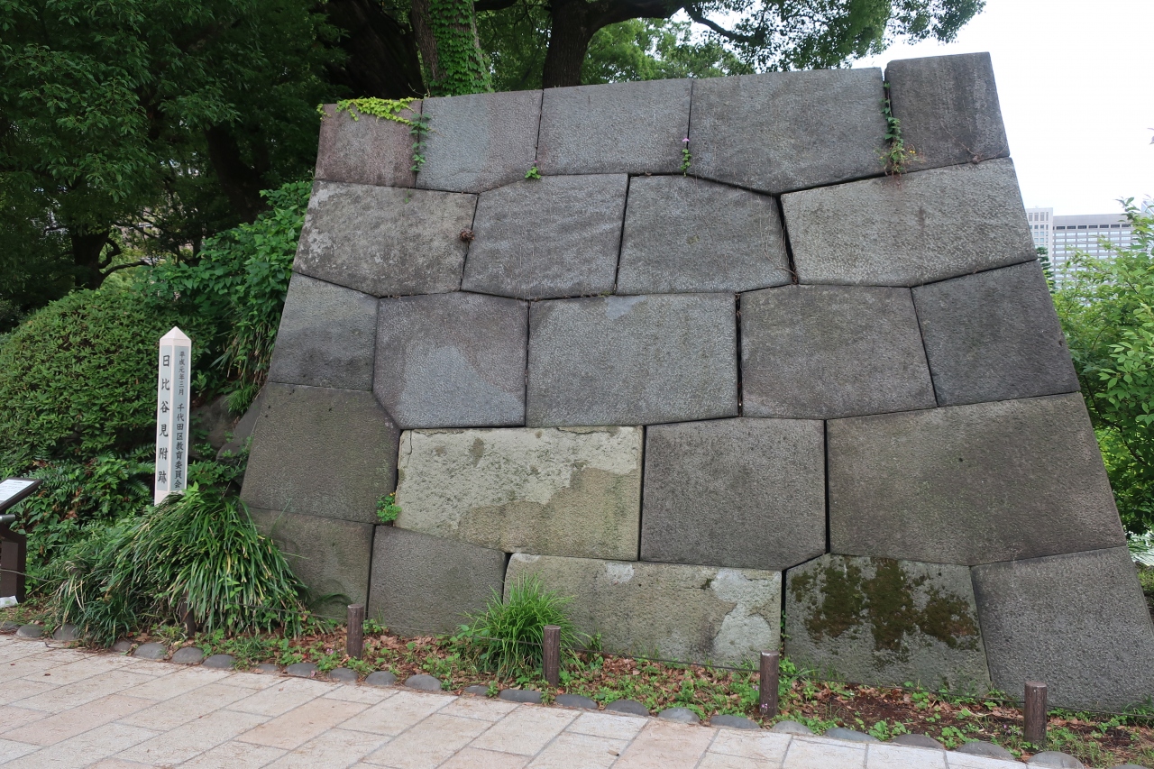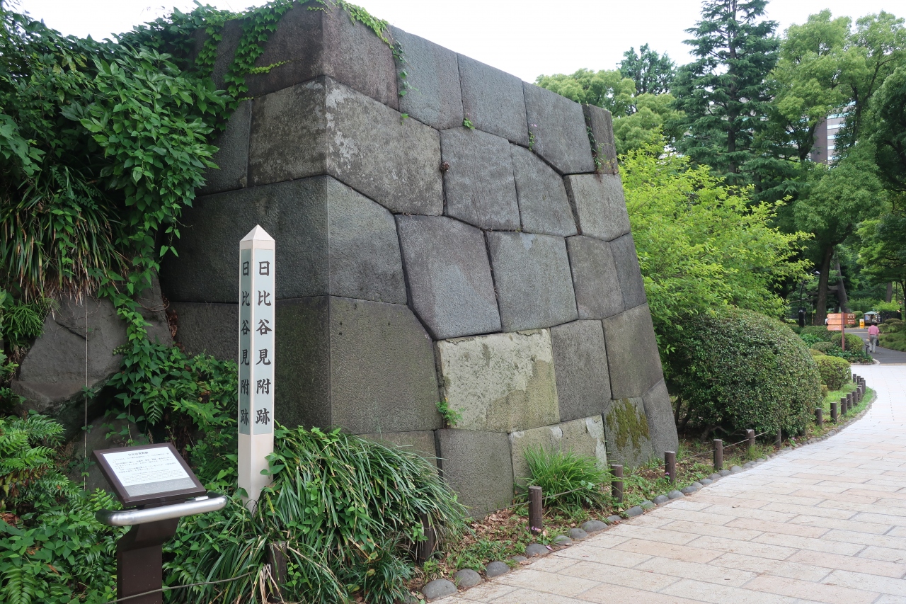 日比谷公園の北東部入口を入って30m程の所に石垣があります。この石垣が日比谷見附跡です。見附とは城の外郭部に作られた砦的な門で、日比谷見附には高麗門、枡形、渡櫓、番所があったそうですが、現在残る石垣は片側の一部しか残っていないのが残念です。しかし、赤坂見附や牛込見附の様に街中ではないので、じっくりと見学できるところが城好きには嬉しいです。