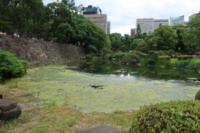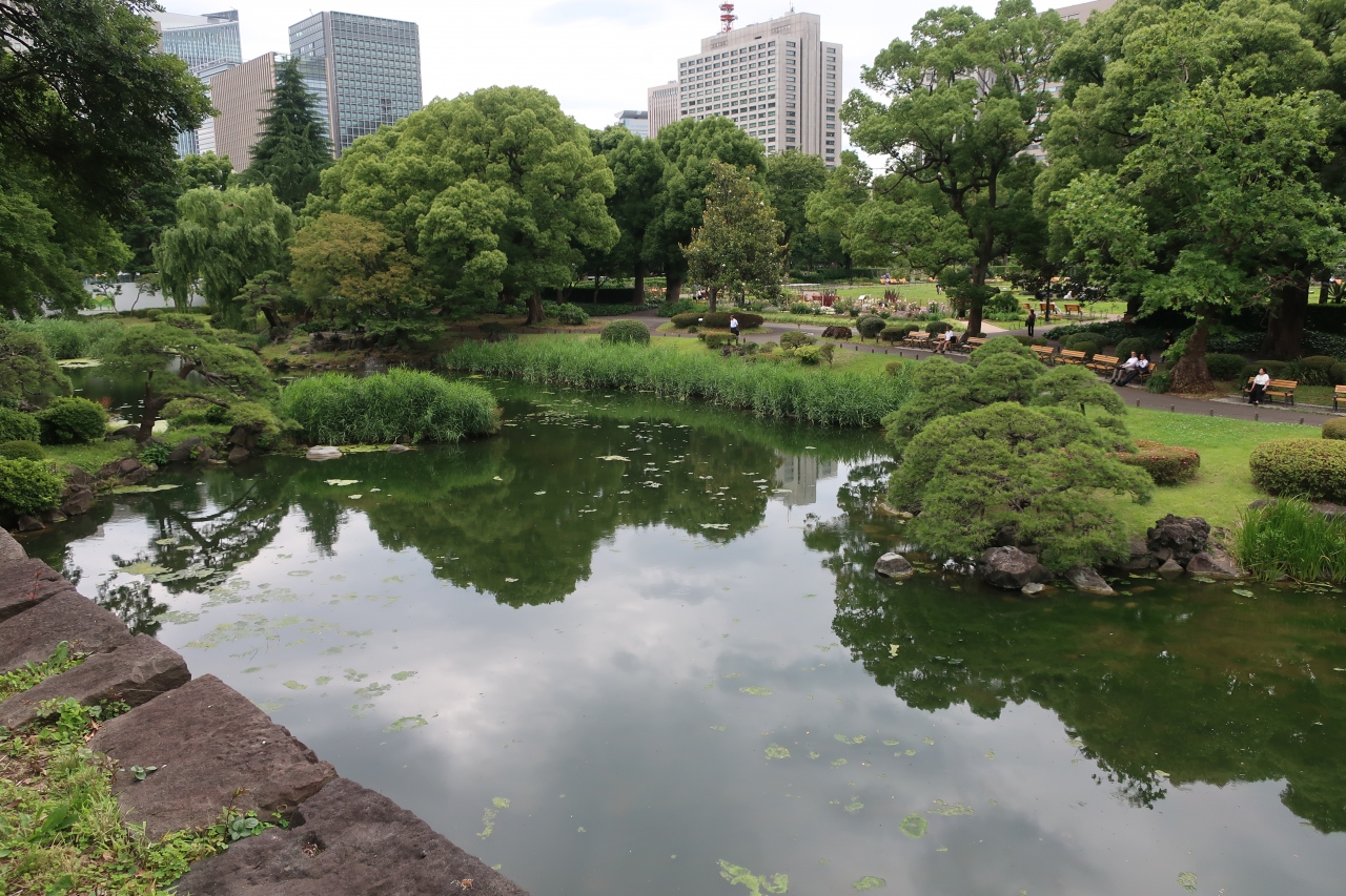 日比谷公園の北東部にある日比谷見附跡の石垣の前にある池が日比谷公園 心字池です。心字池と言う通り上からみると心の字の形をしていますが、元々は江戸城の外濠でした。石垣の上に置かれたベンチに座って心字池に映る木々の緑や空を見ていると都心であることを忘れてしまいます。