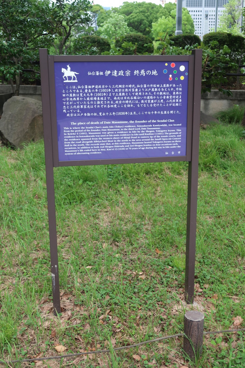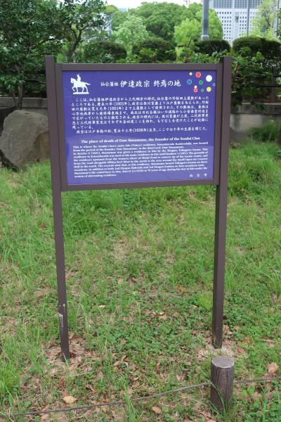 日比谷公園の北東部の入口から日比谷公園に入り、日比谷見附跡を過ぎた先に伊達政宗終焉の地があります。歩道沿いの芝の中に案内板があるだけで、遺構など何もありません。かつてこの地に仙台藩の上屋敷があり、伊達政宗が1636年5月に上屋敷で亡くなってことから終焉の地となっています。見応えはありませんが、意外と歴史好きの人が子の案内板を覗き込む姿が見られ伊達政宗は人気があるなぁと思いました。