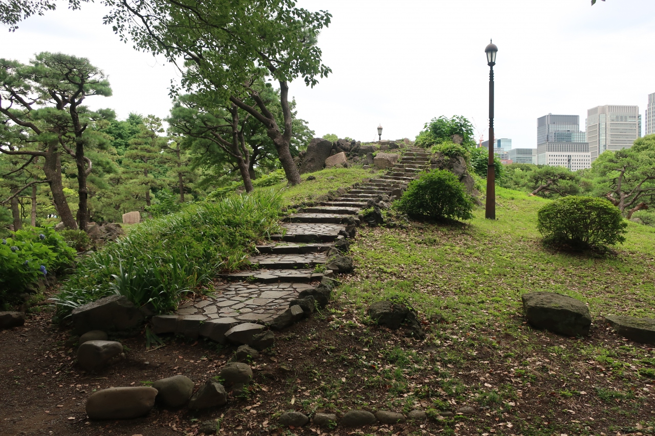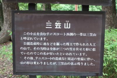 日比谷公園の北西部、テニスコートの横にある古墳の様な低山が三笠山です。日比谷公園の池等を造成する際に排出された土を盛って作った、いわば、ぼた山の様な人工の山です。三笠山には低い松の木が植わる綺麗なところもありますが、登っても石があるだけで見応えはありません。日比谷公園一高い低山です。