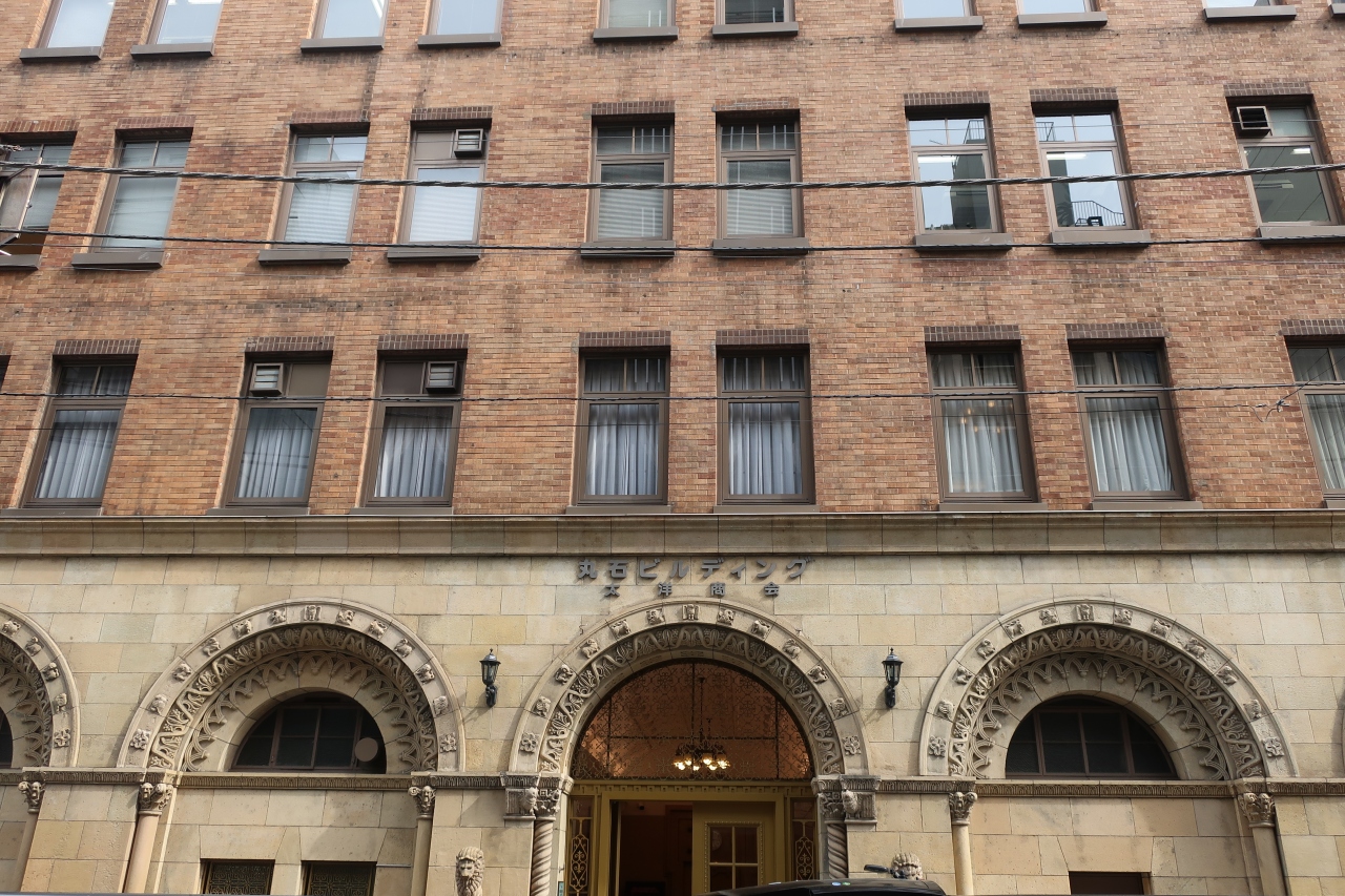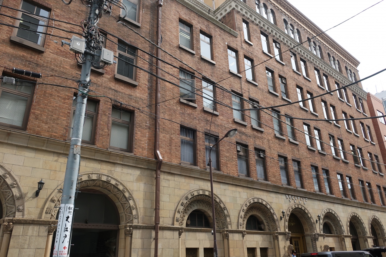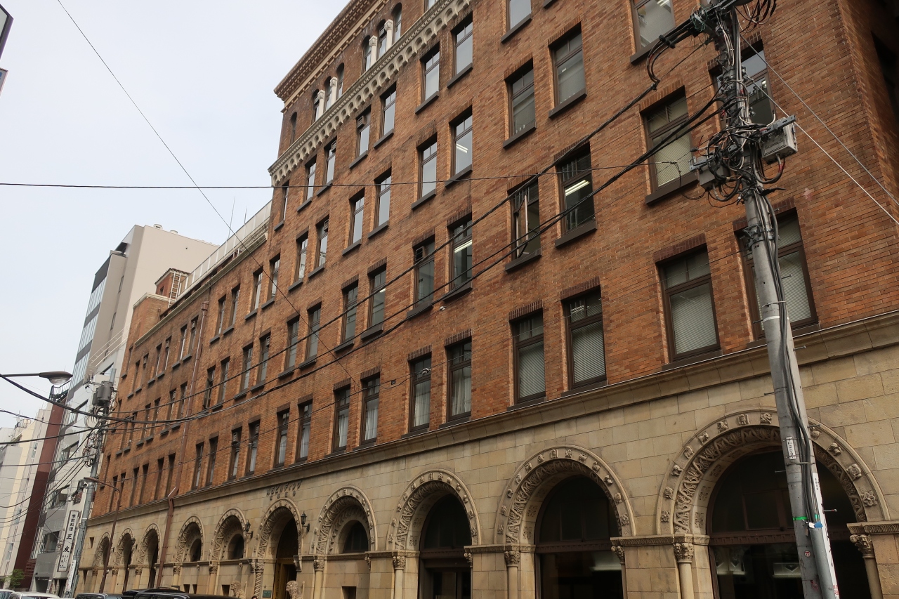 神田駅から近い紺屋町交差点近くにあるビルです。昭和4年頃に建てられた鉄筋コンクリート4階建てのびるですが、ビルの両サイドは新しいビル、このビル自体も4階より上にガラスの建物が増築されそんなに古い感じがしません。どうも最近多い、外壁だけを残した様ですが、昔の姿を残しているのは建築好きには嬉しい限りです。