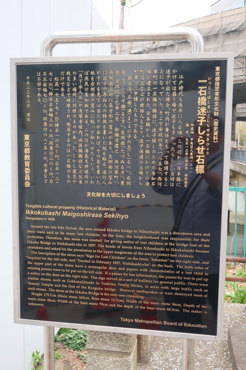 日本橋川に架かる一石橋にある親柱のそばにある古い石柱が一石橋迷子しらせ石標です。正面は、満よひ子の志るべ 、左は、たづぬる方 、右は、志らす類方、と彫られ、訳すと「迷い子の標、訪ねる方、知らせる方」と言う意味です。いつの時代も迷子になる子供いるのかと思うと面白い江戸の遺構です。