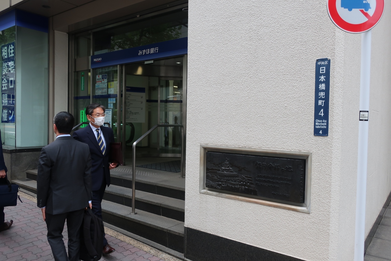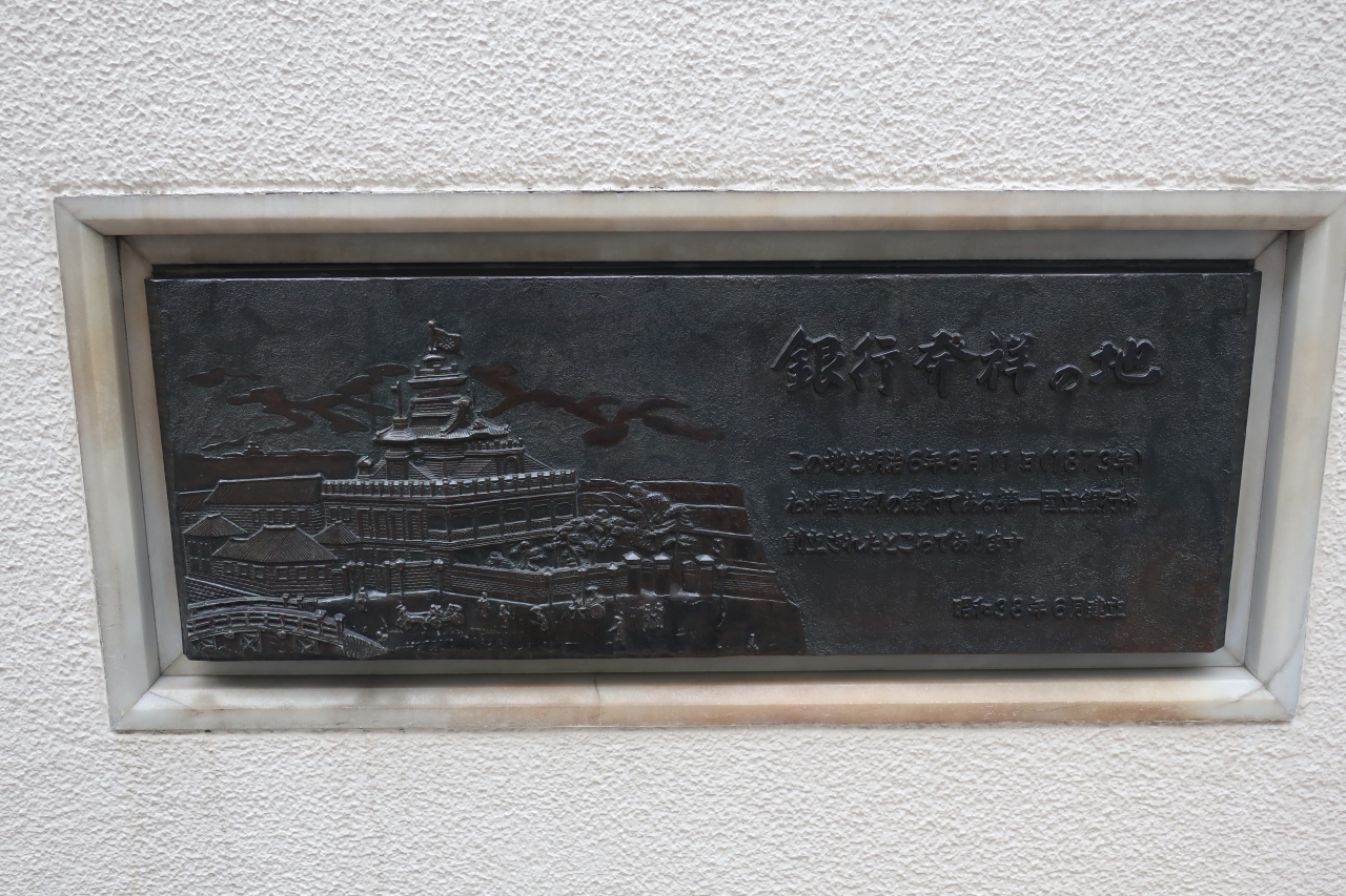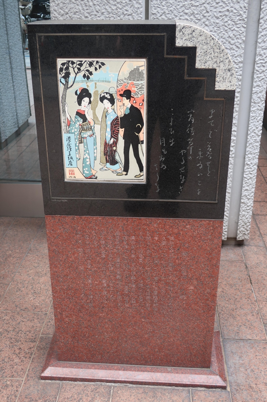 八重洲の一石橋の近くにあるみずほ信託銀行の正面入り口前に夢二・港屋ゆかりの地の碑が建てられています。独特な美人画でなをはせた竹下夢二が人気絶頂の頃(大正3年)にハガキ、絵ハガキ、封筒、版画、手ぬぐい等のステーショナリーを売る港屋をこの碑の近くにあったことからこの碑が建てられています。