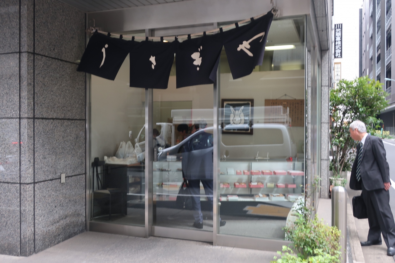 西河岸橋から南に50m程行った日本橋ファーストビルの一角にうさぎや本店があります。小さな店舗で客が6人も入れば一杯です。この店は上野広小路にあるどら焼きの名店うさぎやの暖簾分けしたお店で、この店の名物もどら焼きです。