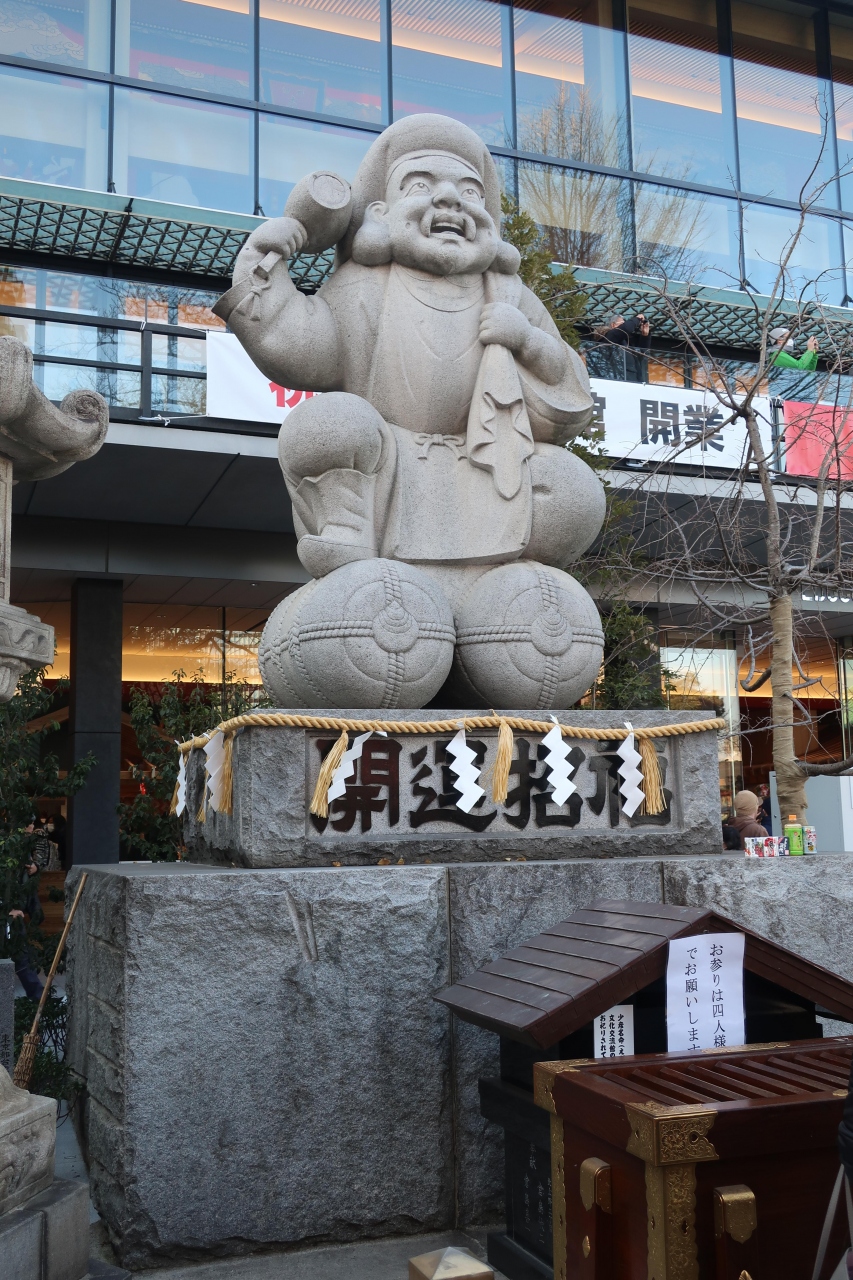 神田明神の境内、隨神門を潜った先すぐの文化交流館の前にある大きなたいこく様の石像です。1月の三連休に神田明神を訪れると、だいこく様尊像の前は長蛇のお参りの人。御神殿の前の列に次いで並んでます。米俵の上に乗り小槌を振る可愛い顔をした大黒様の像は並ぶだけのご利益をきっと授けてくれます。