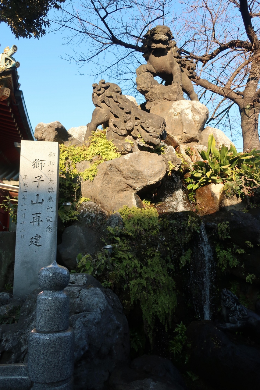 神田明神の本殿に向かって右手に岩が積まれた岩山があります。この岩山が獅子山です。獅子山からは水が流れ落ちる滝が設けられており、そちらにめが行きますが、よく見るとその滝の上に2頭の石獅子が乗っかっています。親獅子が子獅子を谷に突き落とし這い上がってくるのを見守るすがたを現しているそうです。