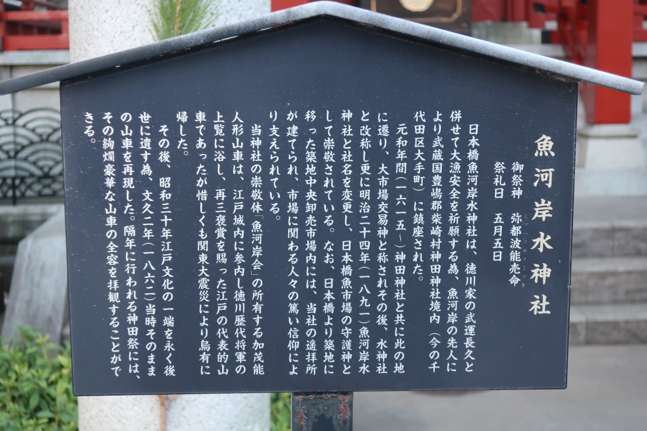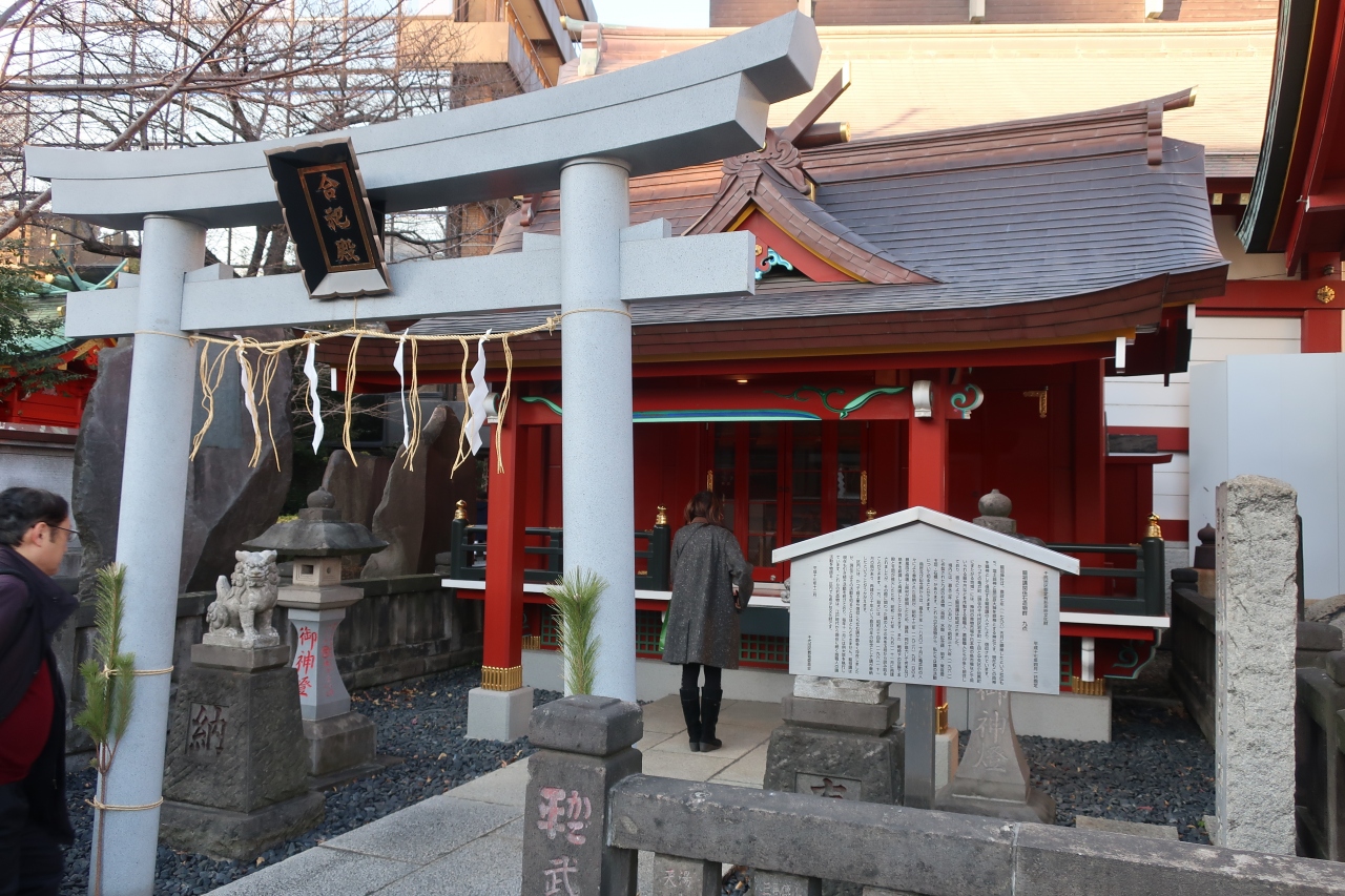 神田明神の本殿を取り囲む様に建立された末社の一つで、丁度本殿の正面左手に位置するのが魚河岸水神社です。聞いたことがある名前だと思ったら、築地の場内に祀られていた魚河岸水神社の本殿がこちらでした。築地の遥拝所は最近豊洲に移されニュースにもなりましたが、ここの本殿があるとは。これも商売繁盛を祈願したもので、如何に神田明神が昔から信仰されていたかが分かる末社です。