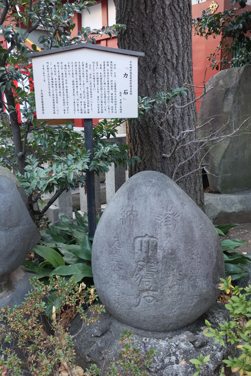 神田明神の末社 江戸神社の近くに、丸っこい石が奉納され鎮座しています。これが力石。江戸時代から残る力試しに使われた石です。古い寺社には力石が数多く残されていますが、現代の人なら持ち上げられそうですが、体格が小さかった当時の人が、本当にこの石を持ち上げられたのか、驚くばかりです。どれ程重いのか試してみたいものです。