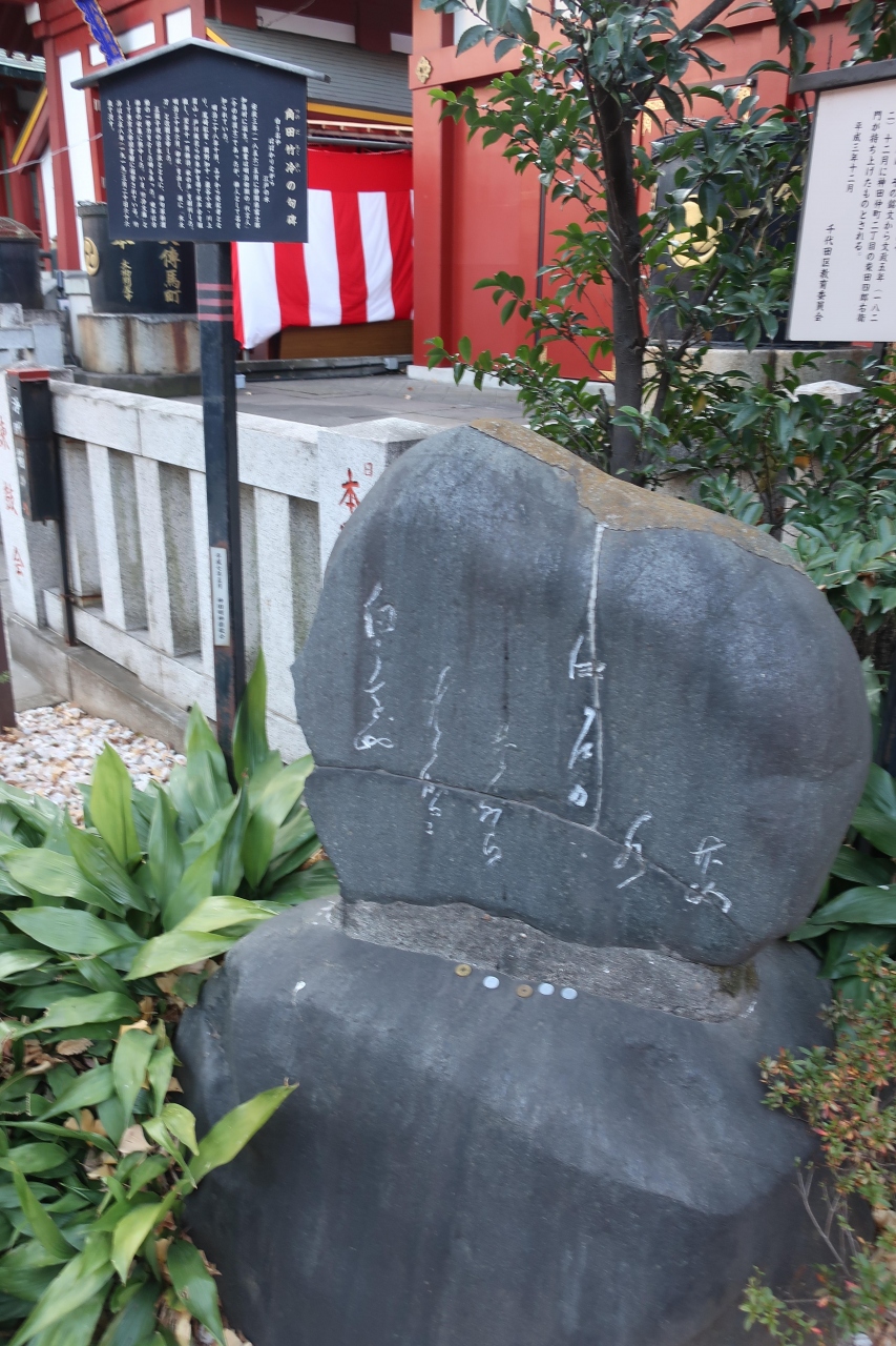 神田明神の御神殿の左手、江戸神社のそばに力石と並んで置かれている石碑が角田竹冷の句碑です。石碑に書かれている句を頑張って読もうとしましたが、余りにも達筆すぎる崩し字で読めません。説明版を見て「白うをや はばかりながら 江戸の水」と詠まれているのが分かりました。角田竹冷はまったく知らない人物ですが、句の意味を知るとなるほどと思える江戸らしい句でした。
