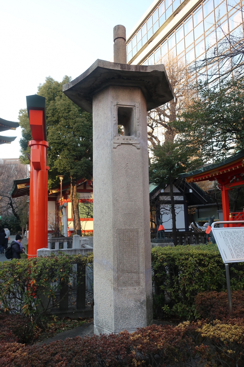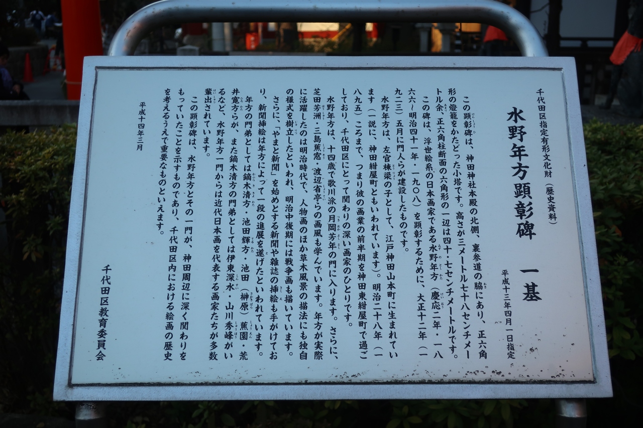 神田明神の御神殿の裏面側、裏参道の横に水野年方顕彰碑があります。縦長の正六角形をした灯籠のような形をした顕彰碑は高さ4m弱あるそうです。明治期に活躍した浮世絵、日本画家であった水野年方は神田山本町に生まれ、神田東紺屋町で画業を過ごしていたと言われ、神田ゆかりの画家です。この顕彰碑を見るまで水野年方を知りませんでしたが、この様な顕彰碑を見学するとその人物の興味を持ち、人物を知りたいという好奇心が沸きます。